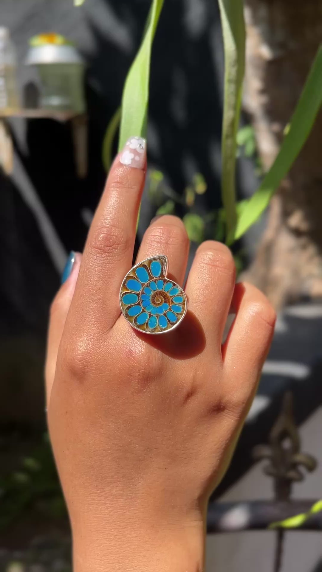 - A rare harmony of earth and ocean, this ring features a genuine fossil Ammonite inlaid with luminous Peruvian Blue Opal. Set in fine Sterling Silver with a wide adjustable tapered shank, its natural spiral and sky-blue tones create a singular treasure, unique and never to be repeated.