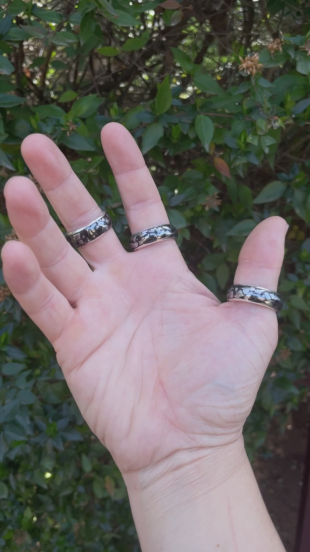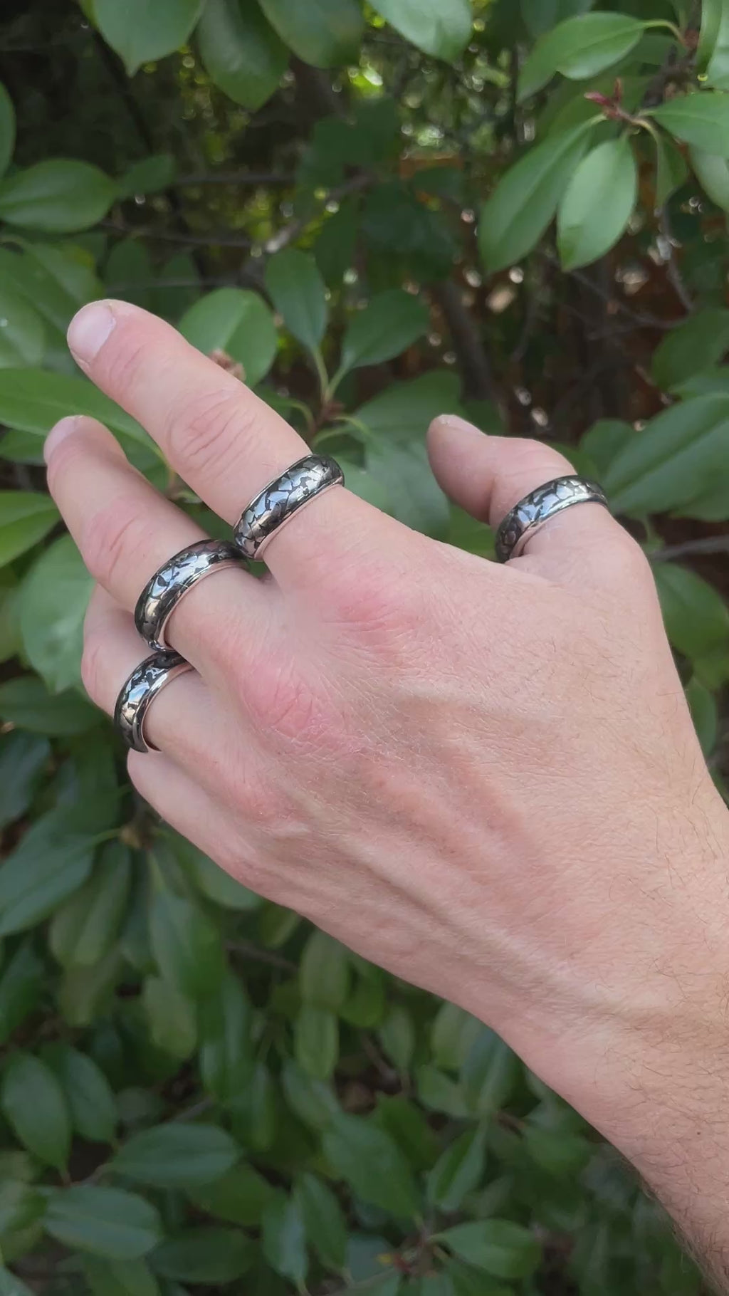 - Captivating Campo del Cielo Meteorite inlay ring, handcrafted in Fine Sterling Silver. This 8.5mm wide ring features very small natural meteorite nuggets, polished and inlaid into this one channel ring. Each of the small meteorites are naturally unique and the rings will differ slightly. However, the ring you receive will look similar to the images shown.