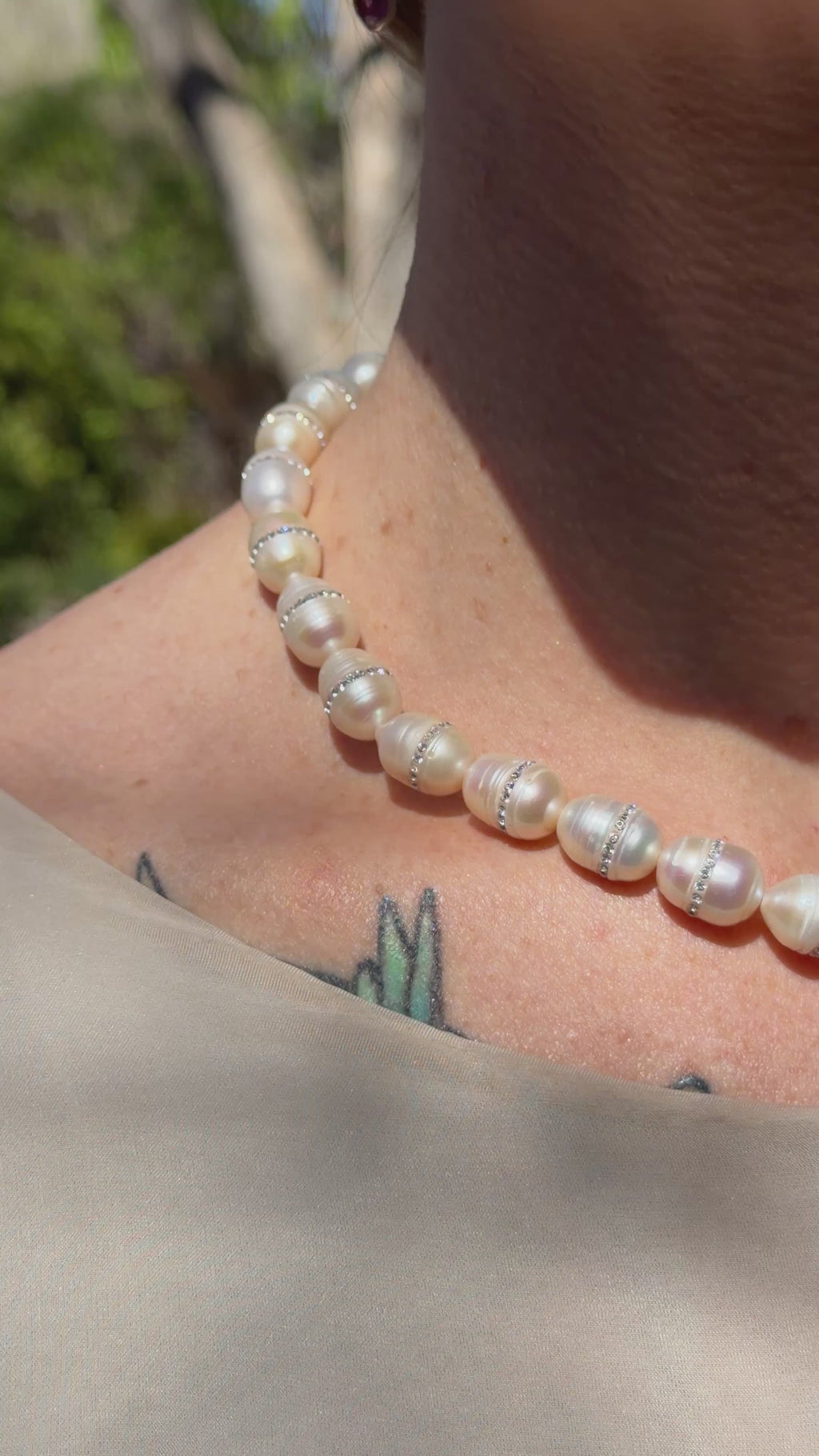 This elegant necklace features cream freshwater pearls, each individually inlaid with Swarovski crystals, creating a refined interplay of soft luster and delicate sparkle. The subtle brilliance of the crystal accents enhances the natural glow of the pearls, adding dimension and a modern touch to a classic design.