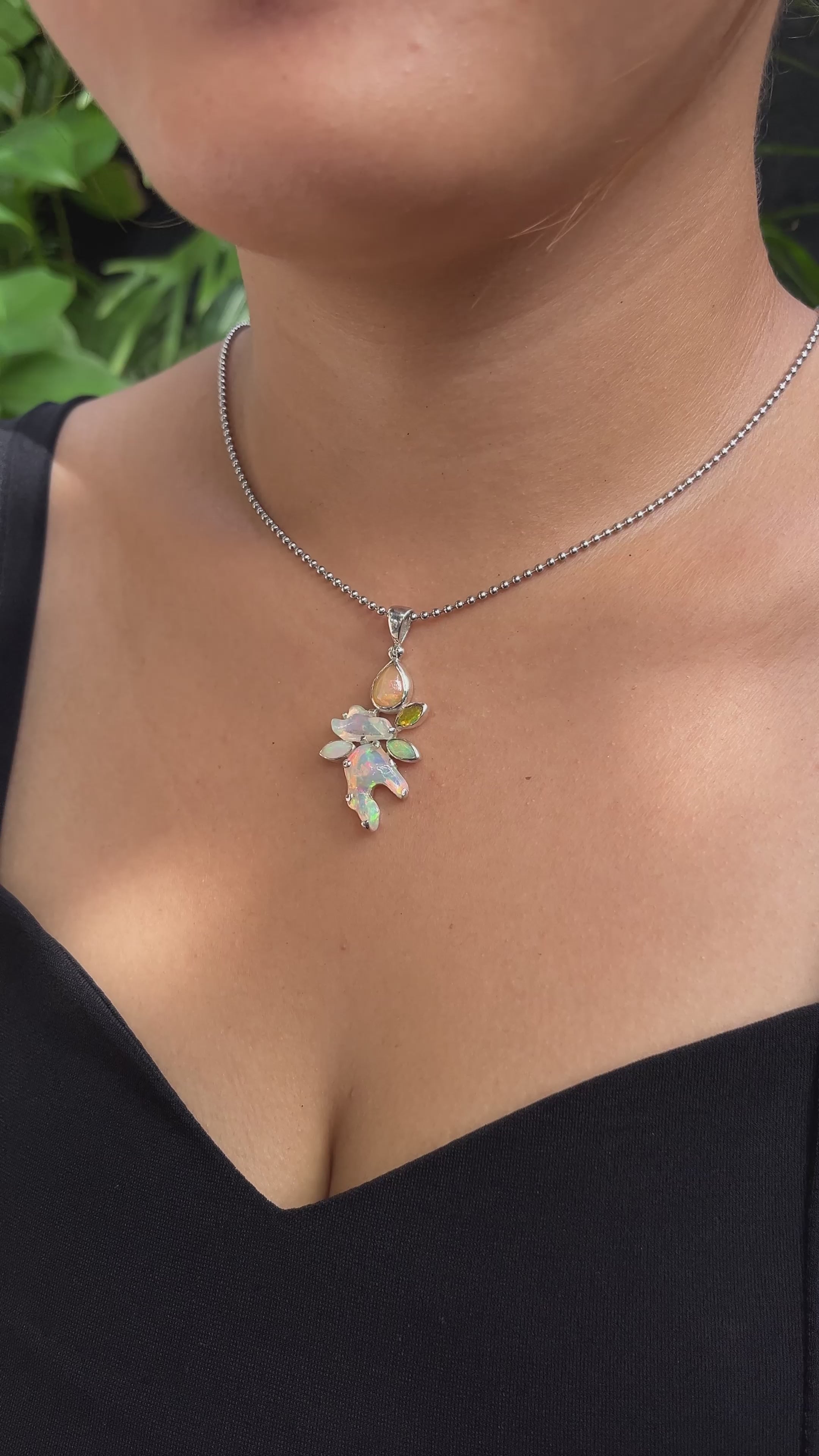 A tribute to nature’s artistry, this one-of-a-kind pendant showcases a harmonious blend of tumbled, faceted, and cabochon Ethiopian Opals. Each stone is carefully hand-selected and thoughtfully arranged to create a balanced, flowing composition. Set in 925 Sterling Silver with a combination of bezel and prong settings, this pendant allows the opals’ natural beauty to shine from every angle.