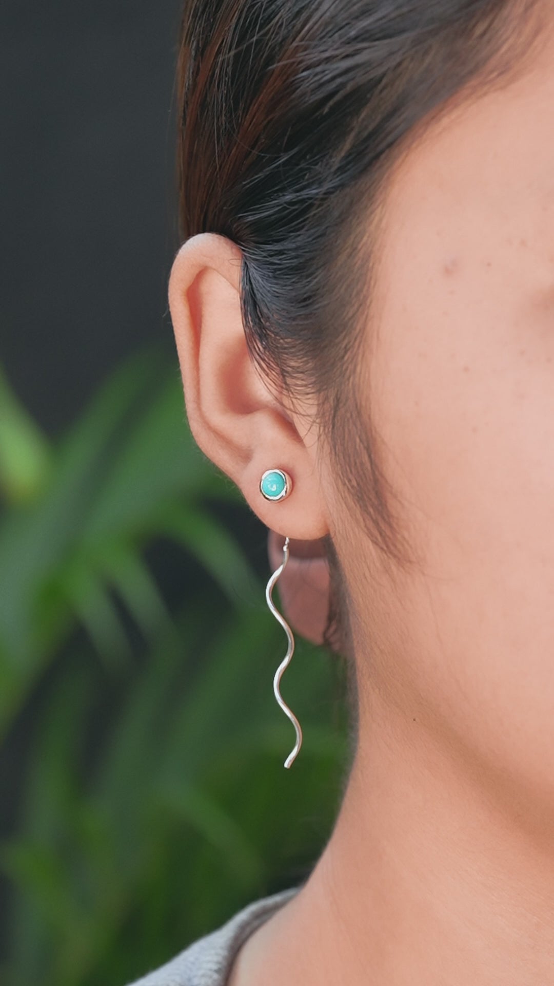 - Handcrafted in 925 Sterling Silver, these stud earrings feature a hand-selected 5mm Turquoise cabochon set in a smooth bezel. A delicate 1.5cm chain with a flowing 4cm curled wire drop drifts gracefully, showcasing Turquoise’s vivid sky-blue color and natural matrix.