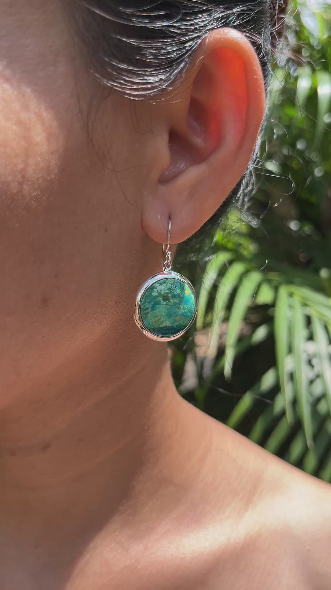 - Gracefully timeless, these medallion style earrings are crafted in 925 fine Sterling Silver and showcase a round 18 mm Peruvian Blue Opal. Its soft blue-green hues create a serene yet elegant look. Earrings measure approx. 1.5 inches tall by 0.8 inches wide (3.8 cm × 2.0 cm).