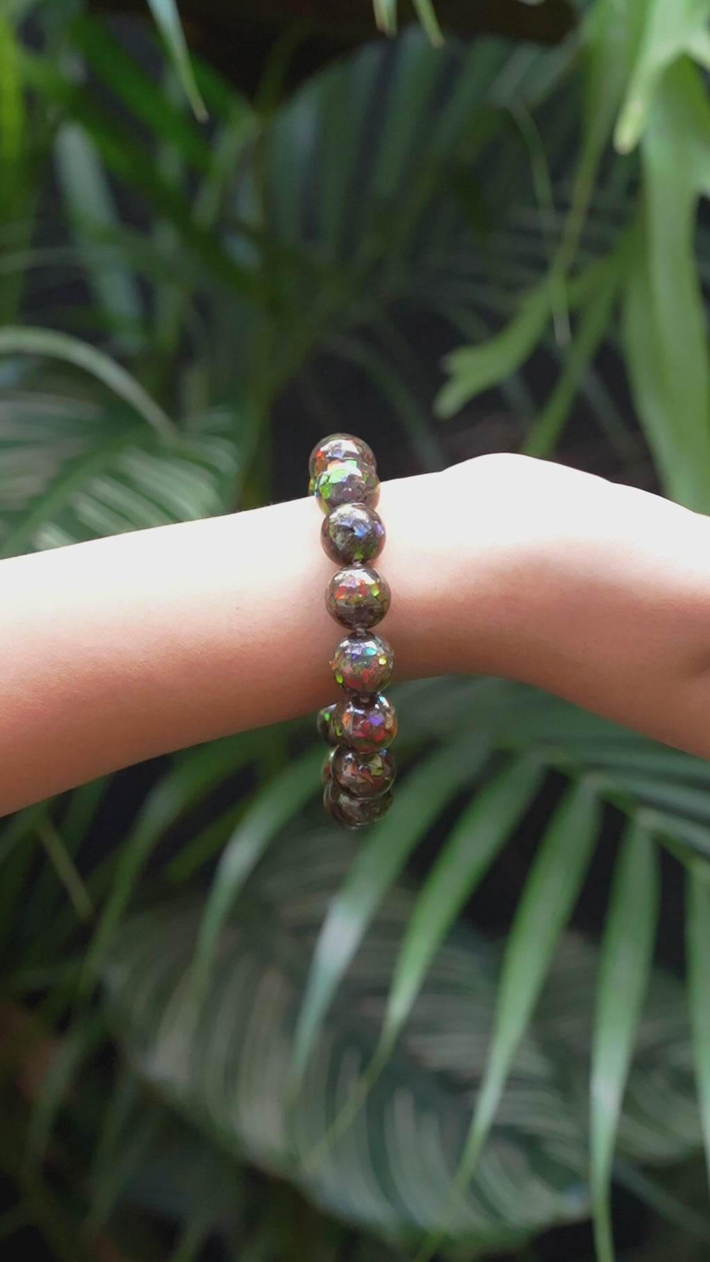 - Esta deslumbrante pulsera de cuentas presenta cuentas de ammolita de 11 o 14 mm con un revestimiento transparente duradero para protección adicional. Nuestros artesanos incrustan la ammolita colorida a mano. Cada patrón de ammolita es naturalmente único y puede diferir ligeramente de la imagen. Sin embargo, la forma general y el equilibrio de colores serán similares.