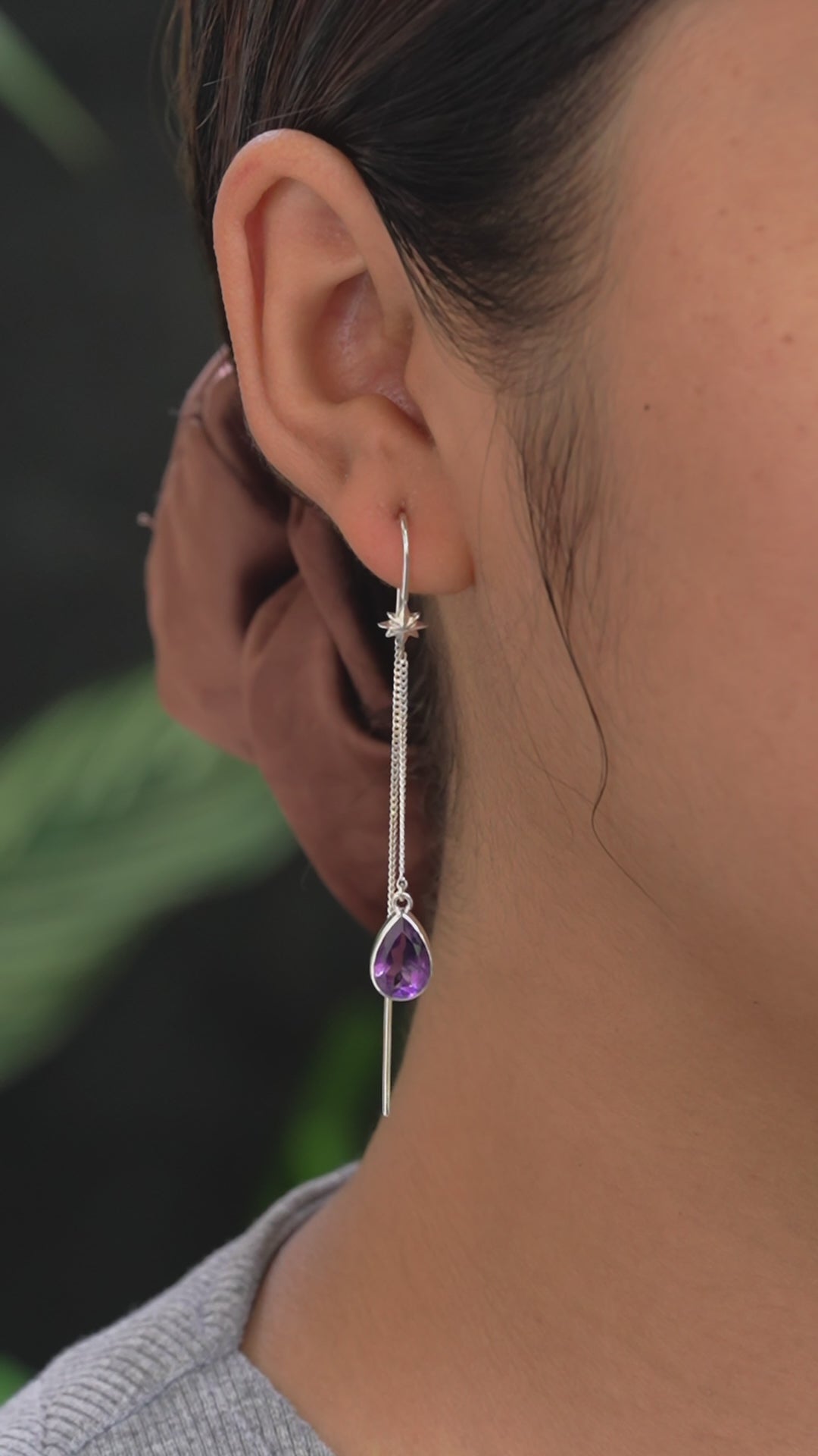 - Gracefully flowing with every movement, these 925 Sterling Silver threader earrings measure approximately 2.30–2.40 inches (5.84cm-6.10cm) in total length. Delicate star accents trace the slender chain, drawing the eye to a luminous 10×7 mm pear-faceted Amethyst that sways softly.