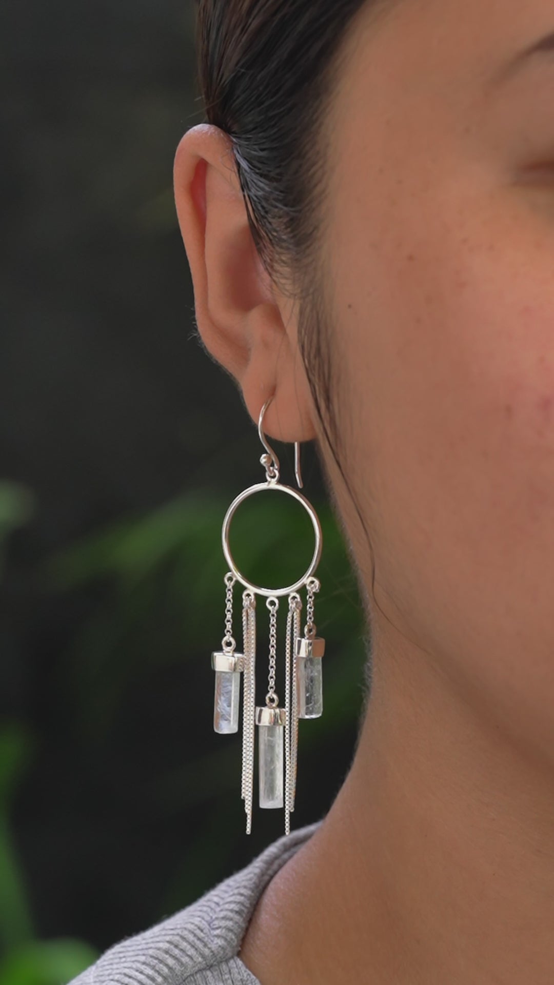 - These Sterling Silver earrings feature 3 Aquamarine crystals, carefully hand-selected & matched for their soft blue tones & natural clarity. Accented with fine box chains, the crystals sway gracefully with movement, catching the light with effortless boho elegance. Measure approx. 2.95" long by 0.85" wide (7.5 cm × 2.2 cm).