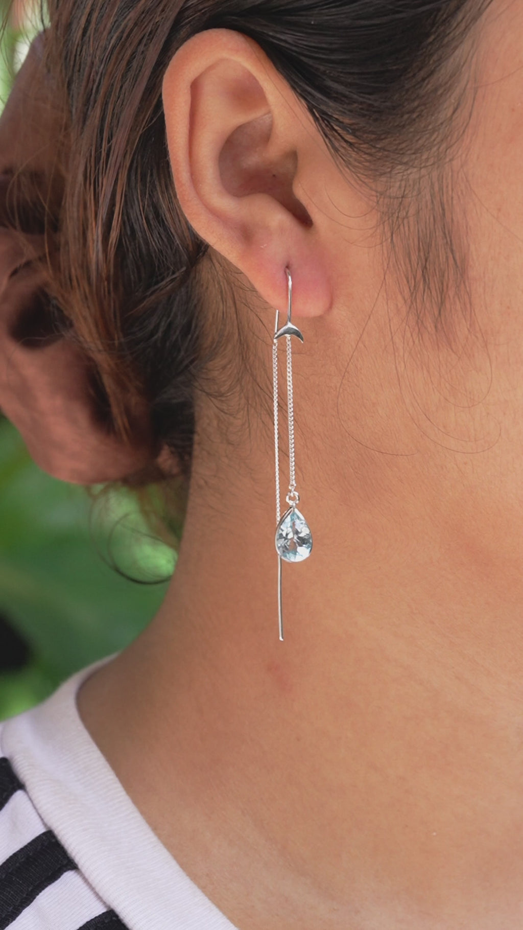 - Designed to move with effortless grace, these 925 Sterling Silver threader earrings measure approximately 2.30–2.40 inches (5.85 cm - 6.10 cm) in total length and feature refined crescent moon accents with a luminous 10×7 mm pear-faceted Blue Topaz. The slender chain allows gentle movement and a soft, light-catching shimmer.