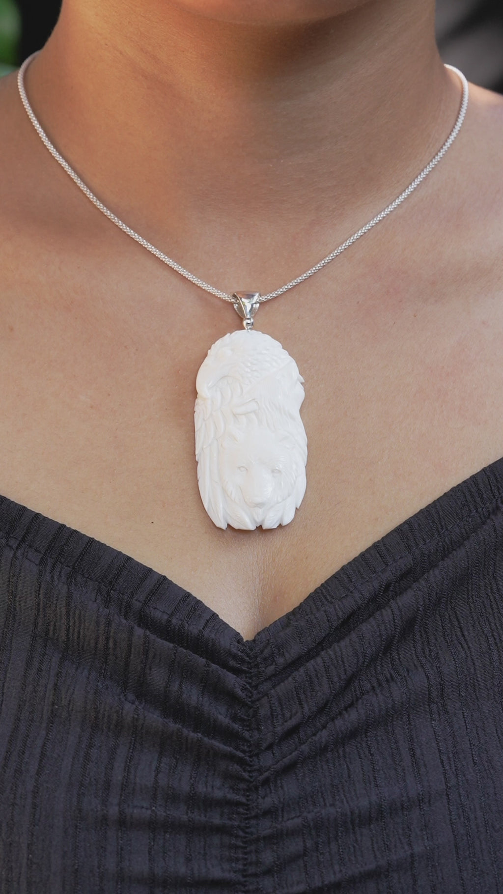 - Rich in character and craftsmanship, this pendant features a Bear, Wolf, and Eagle meticulously hand-carved from natural buffalo bone. Showcasing exceptional detail in every contour, feather, and facial feature. Finished in 925 Sterling Silver with an insert bale. Measures approximately 2.8–3 inches tall by 1.1–1.3 inches wide (7.1-7.6 cm x 2.8-3.3 cm).