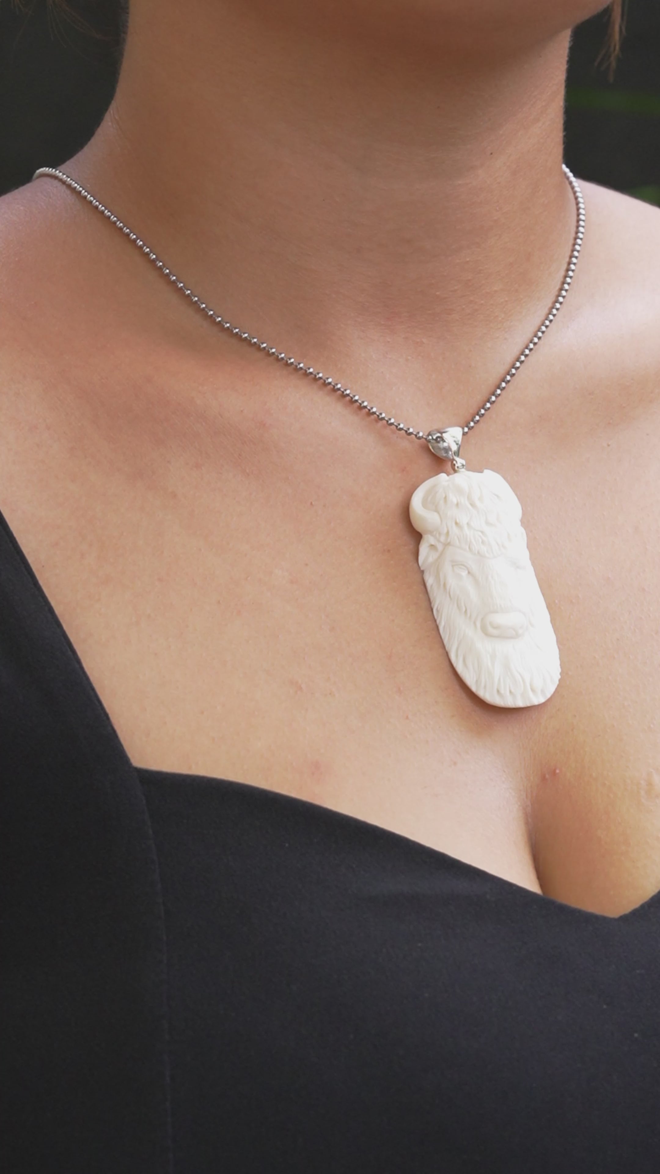 - Rich in character and craftsmanship, this Bison Head Carving pendant is hand-carved from natural buffalo bone. Finished in 925 Sterling Silver with an insert bale, the piece measures approximately 2.8-3" in tall by 1.1-1.3" in wide (7.1-7.6 cm x 2.8-3.3 cm), with natural variation in each piece.