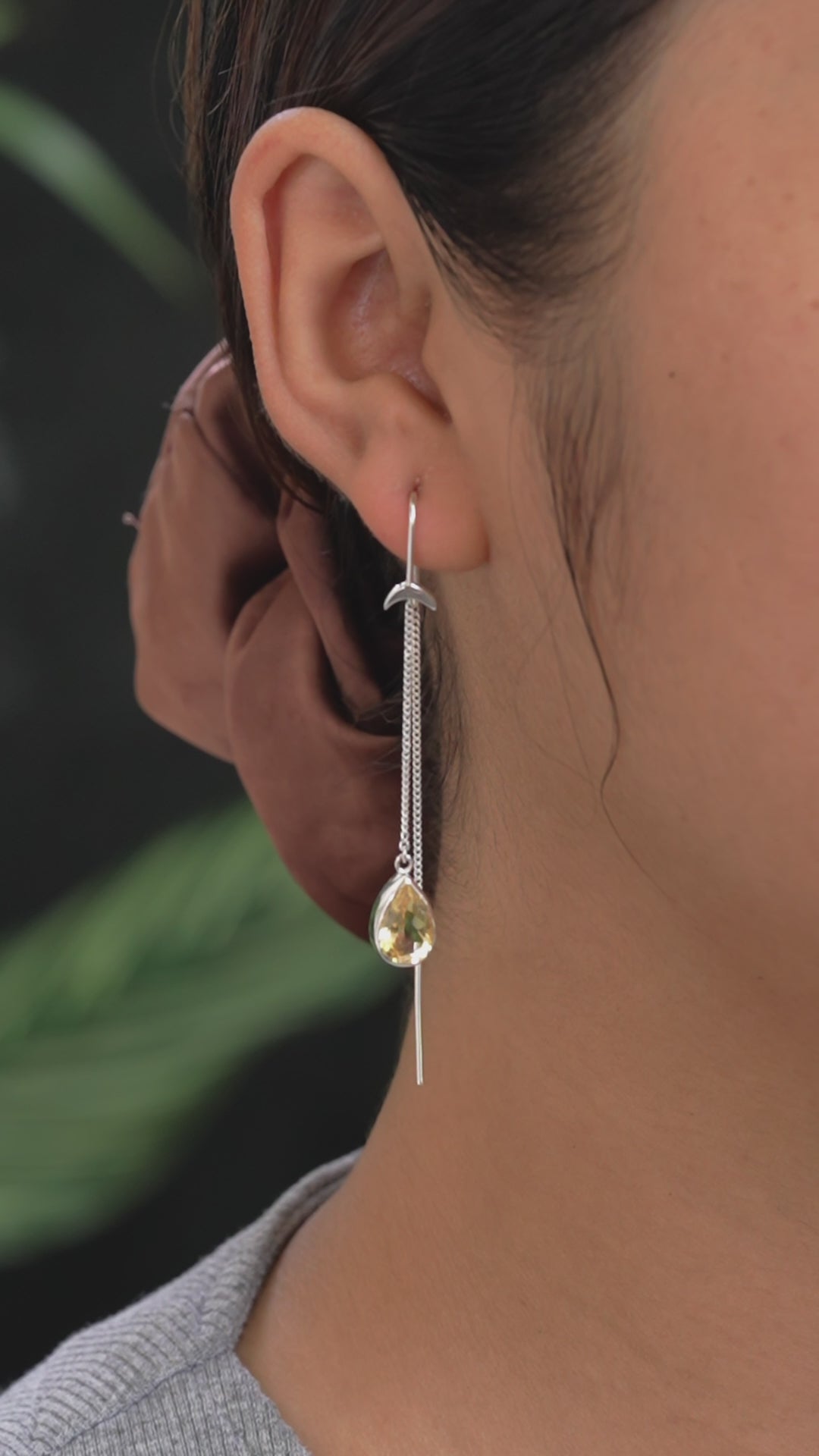 - Designed to flow with you, these 925 Sterling Silver threader earrings measure approximately 2.30–2.40 inches (5.84cm-6.10cm) in total length and showcase a minimalist crescent moon accent with a glowing 10×7 mm pear-faceted Citrine. The slender chain allows the gemstone to sway freely, creating an elegant play of light.