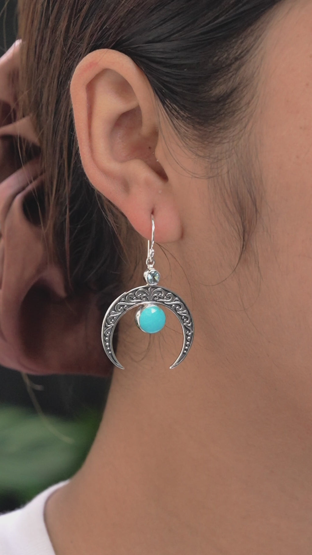 - Handcrafted in 925 Sterling Silver, these earrings feature delicate crescent moon filigree, centered with an 8mm round Sleeping Beauty Turquoise and accented with a sparkling 4mm faceted Blue Topaz. Measuring approx. 1.8" tall × 1.1" wide (4.6 × 2.8 cm), they radiate serene celestial charm.