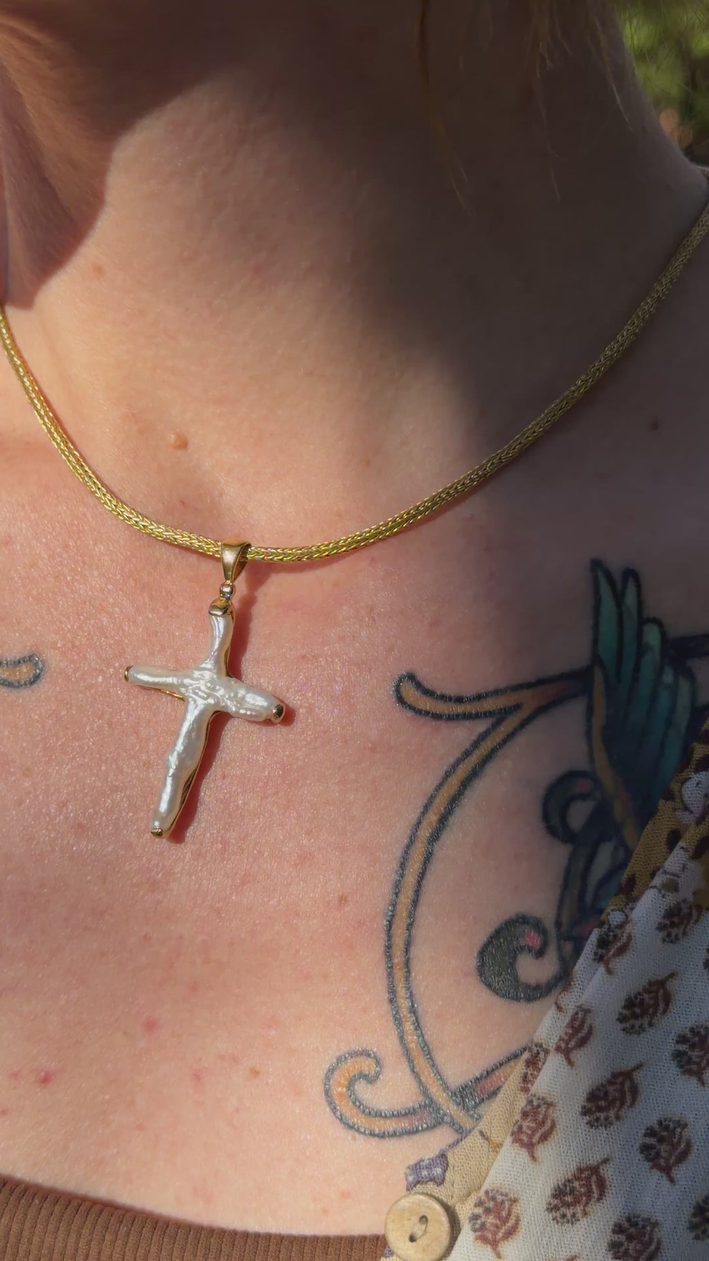 This distinctive pendant features a cross-shaped cultured pearl, an extraordinary formation created when a cross-shaped nucleus is placed inside a mussel. Over the course of 1–2 years, the mollusk naturally deposits layers of luminous nacre around the nucleus, forming a single solid pearl with a beautifully defined cross silhouette. While the shape is guided by human technique, the material itself is genuine pearl—formed naturally by the mollusk and prized for its soft luster and organic character.