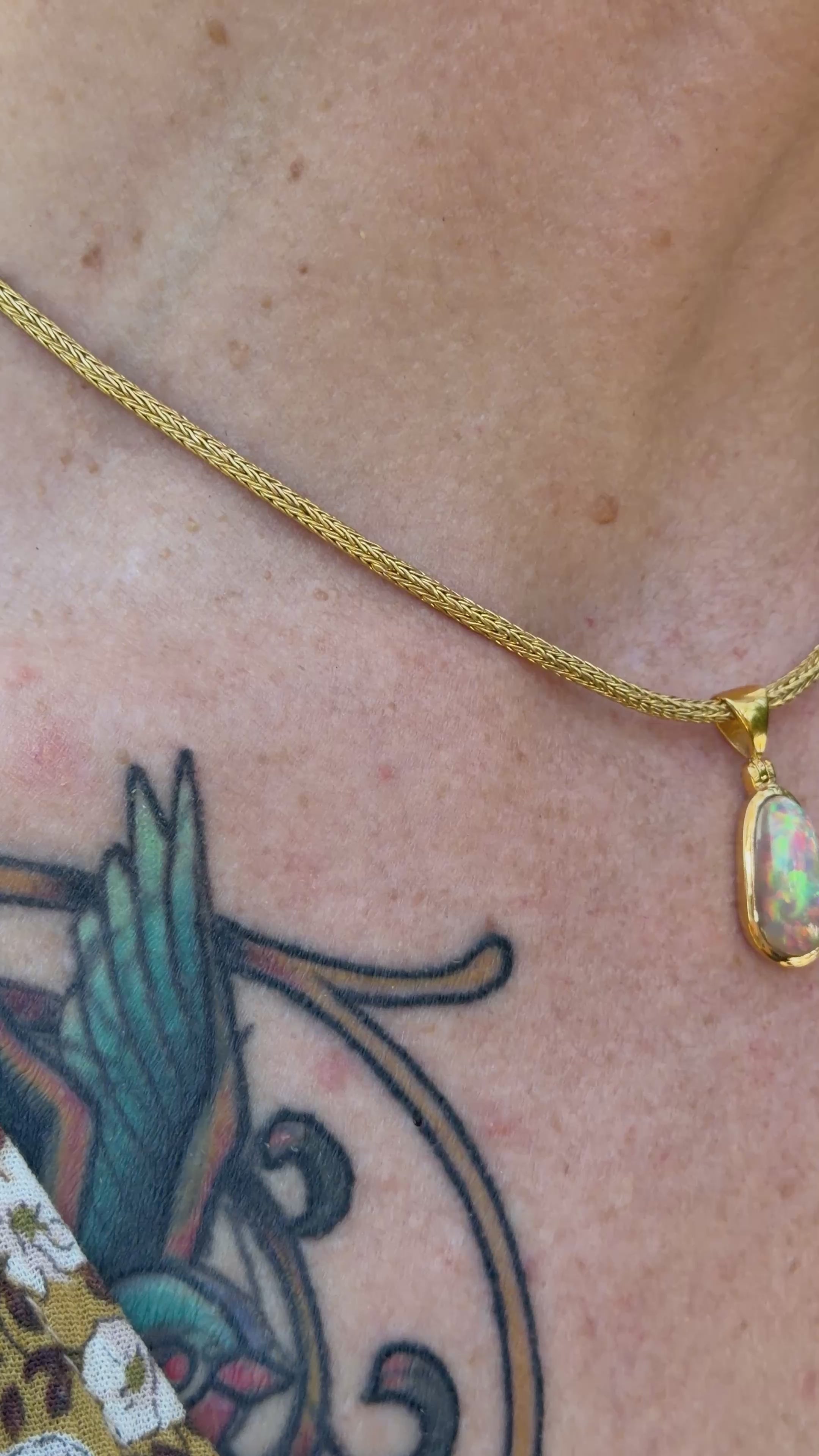This elegant one-of-a-kind pendant features a luminous Ethiopian Opal, celebrated for its remarkable play of color. Flashes of fiery reds, vibrant greens, and electric blues shimmer across the stone, creating a dynamic display of light that shifts with every movement.