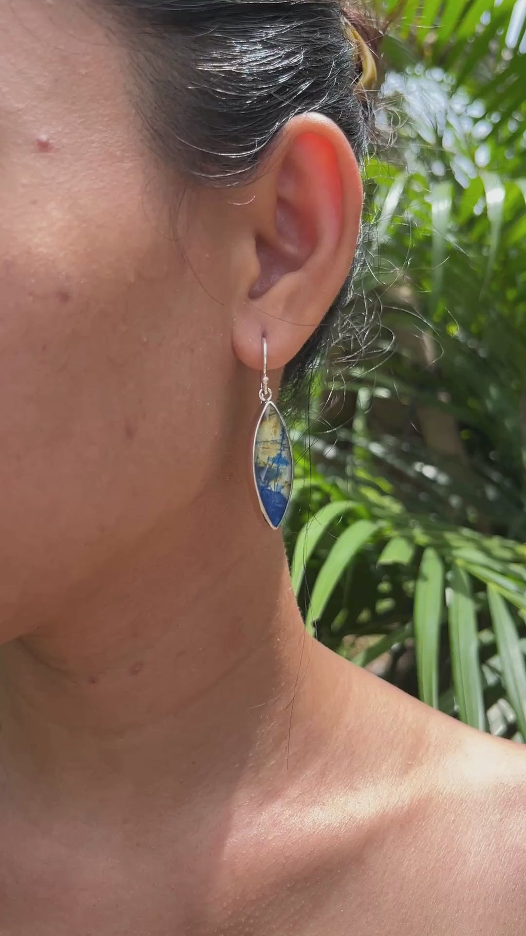 - Estos hermosos aretes presentan malaquita azurita natural con una tapa protectora de vidrio de cuarzo facetado de grado óptico, engastados en una encantadora forma de marquesa de 10x30 mm. Bisel de plata de ley, aproximadamente 1,80 pulgadas de largo x 0,45 pulgadas de ancho (incluido el alambre para la oreja).