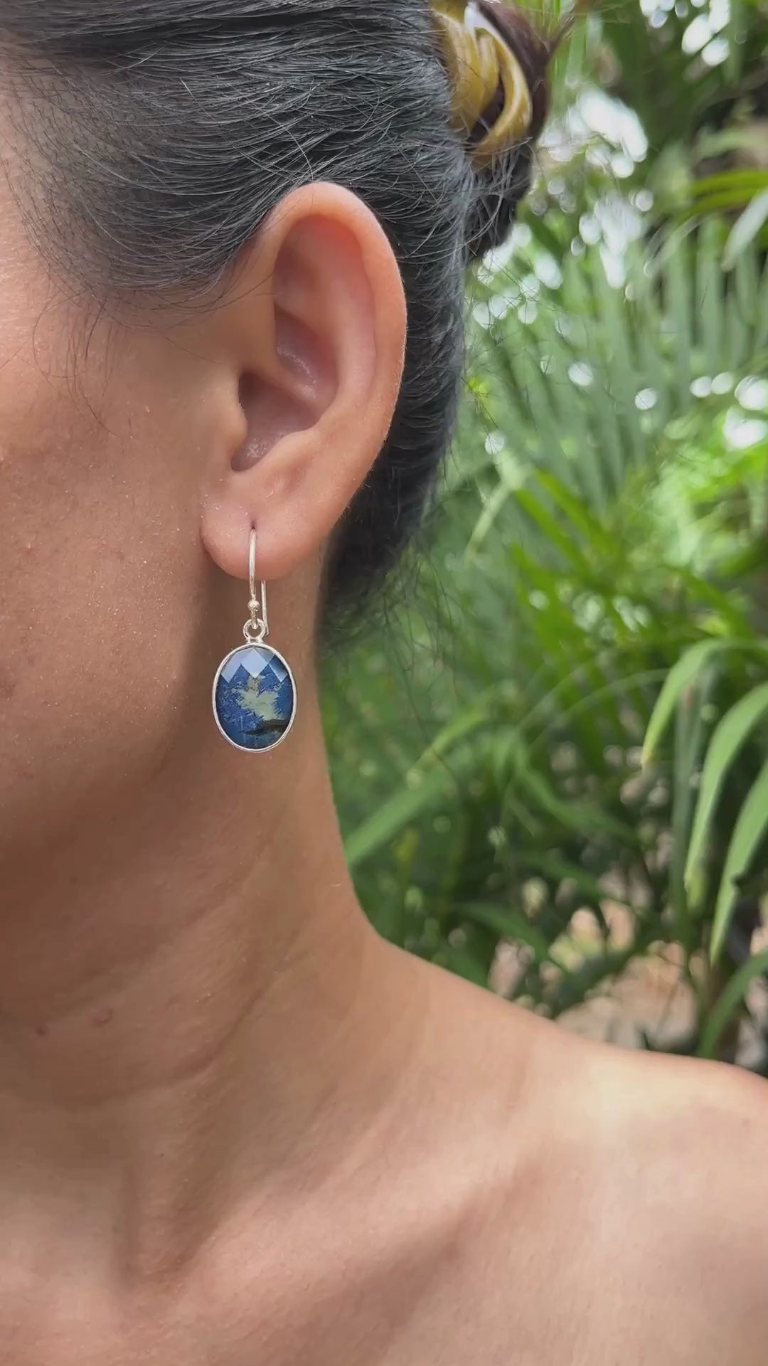 • Estos hermosos aretes presentan malaquita azurita natural con un doblete de cuarzo facetado transparente, engastados en una encantadora forma ovalada de 12x16 mm. Bisel de plata de ley, aproximadamente 1,35 pulgadas de largo x 0,50 pulgadas de ancho (incluido el alambre para la oreja).