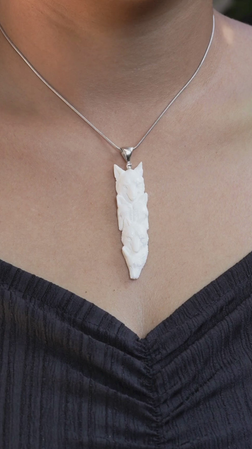 - Meticulously hand-carved from natural buffalo bone, this pendant features 5 wolf heads, capturing intricate fur details of each wolf in a layered composition. Finished with a 925 Sterling Silver insert bale. Measures approx. 2.7–2.9 inches tall by 0.6–0.65 inches wide (6.9–7.3 cm × 1.5–1.6 cm).