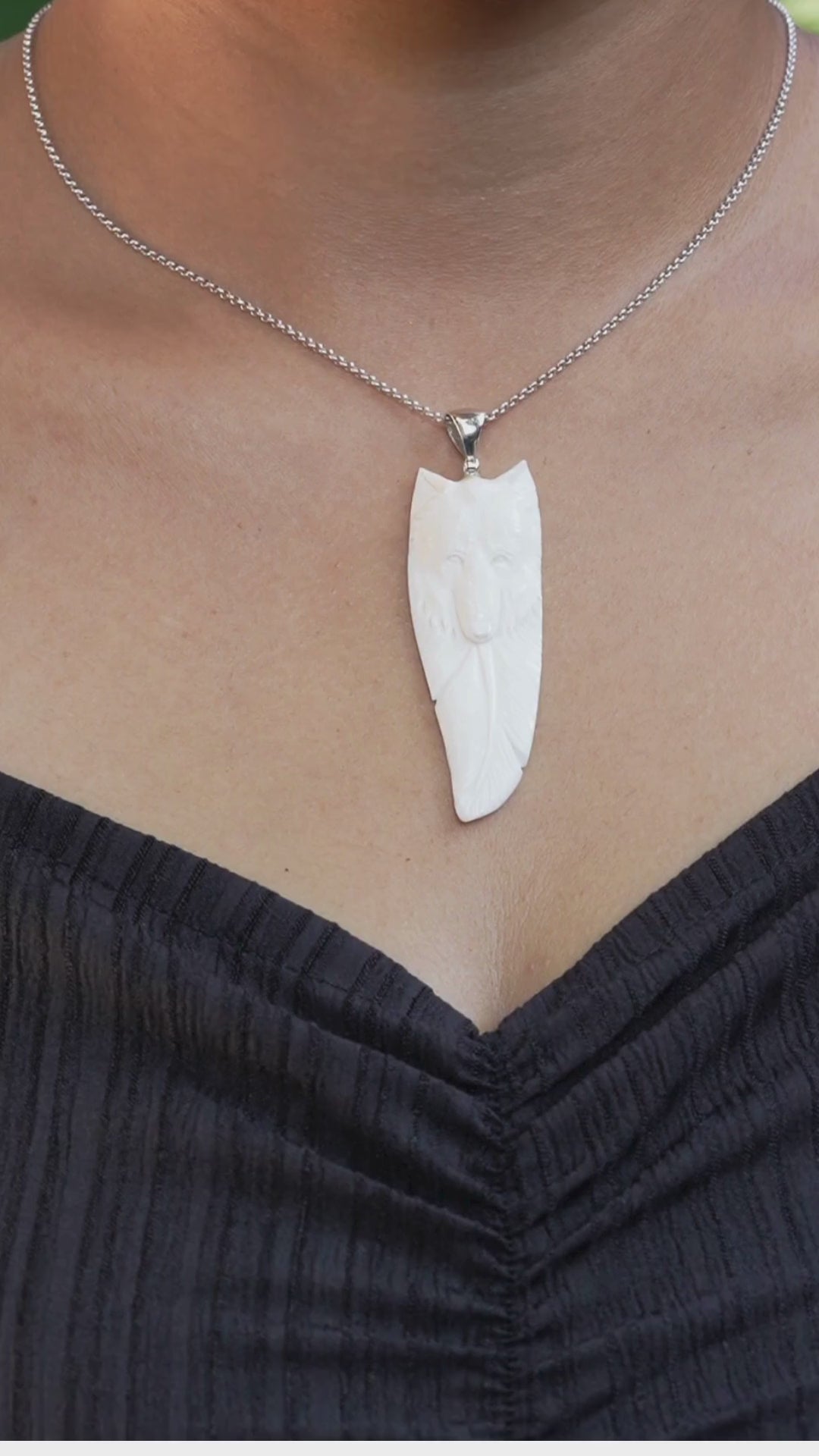- Rich in character and craftsmanship, this pendant features a Wolf Head and Feather that's been meticulously hand-carved from natural buffalo bone, highlighting exceptional detail in the facial features, fur texture, and flowing feather elements. Finished with a 925 Sterling Silver insert bale. Measures approx. 2.8–3 inches tall by 1.1–1.3 inches wide (7.1–7.6 cm × 2.8–3.3 cm).