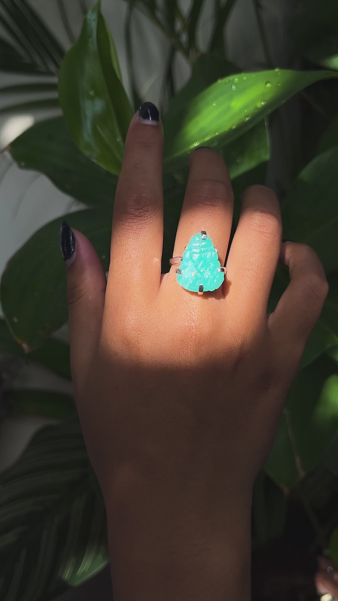 Set in 925 Sterling Silver, the stone is elevated by a precision-crafted mounting that accentuates the carving without distraction. The 3 mm adjustable hammered shank provides added comfort, durability, and a touch of artisanal texture. This rare combination of hand-sculpted gemstone and thoughtfully designed setting makes the ring a standout, collectible piece.