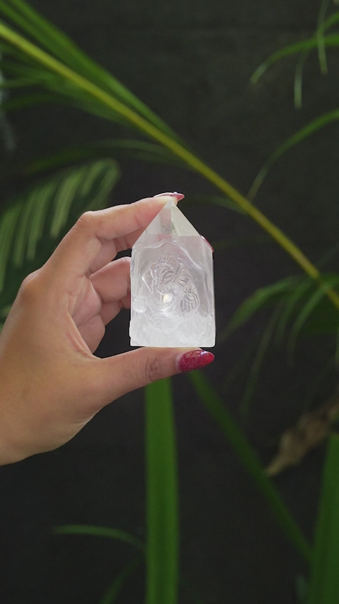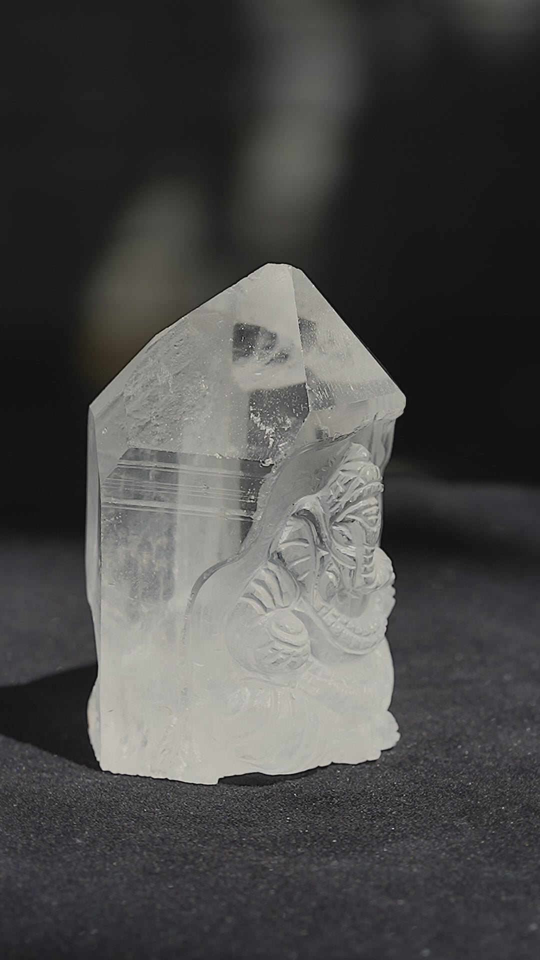 - Rare and radiant, this Quartz crystal is meticulously hand-carved into a Ganesha, with a naturally terminated top. Every intricately sculpted detail reflects masterful artistry, making this a unique, unrepeatable, one-of-a-kind gemstone treasure.