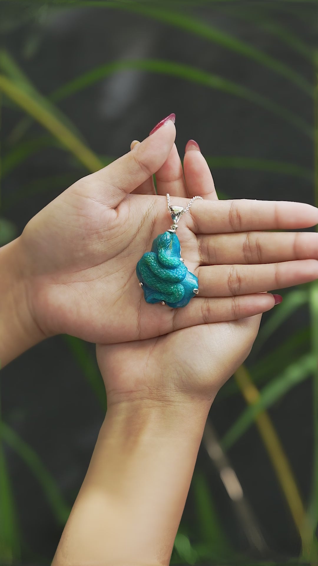 Crafted in solid 925 Sterling Silver with a minimalist prong-set design, this pendant showcases the rare Peruvian Blue Opal carving in its purest form. The green snake stands boldly from the blue stone, while the understated silverwork provides a refined, supportive setting that enhances the piece’s one-of-a-kind beauty.