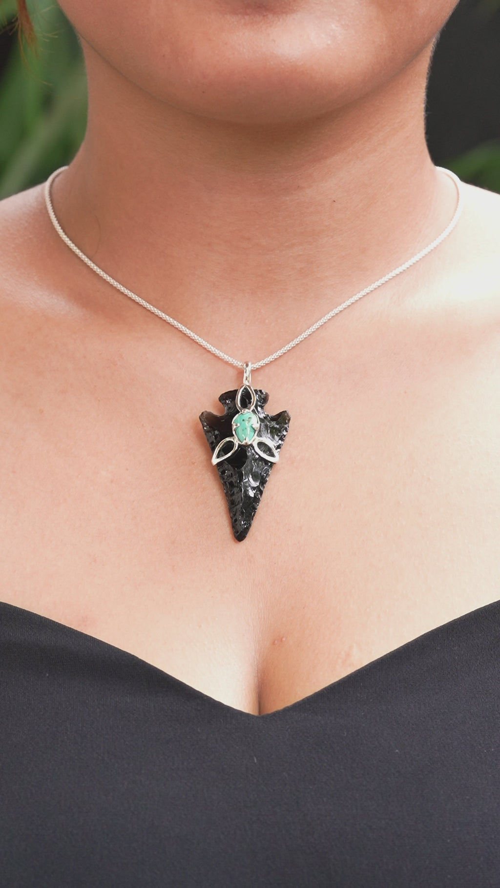 - Measuring approx. 2.4–2.6" tall by 1–1.3" wide, this pendant offers a bold and striking presence, allowing the glossy obsidian arrowhead and vibrant turquoise accent to take center stage.