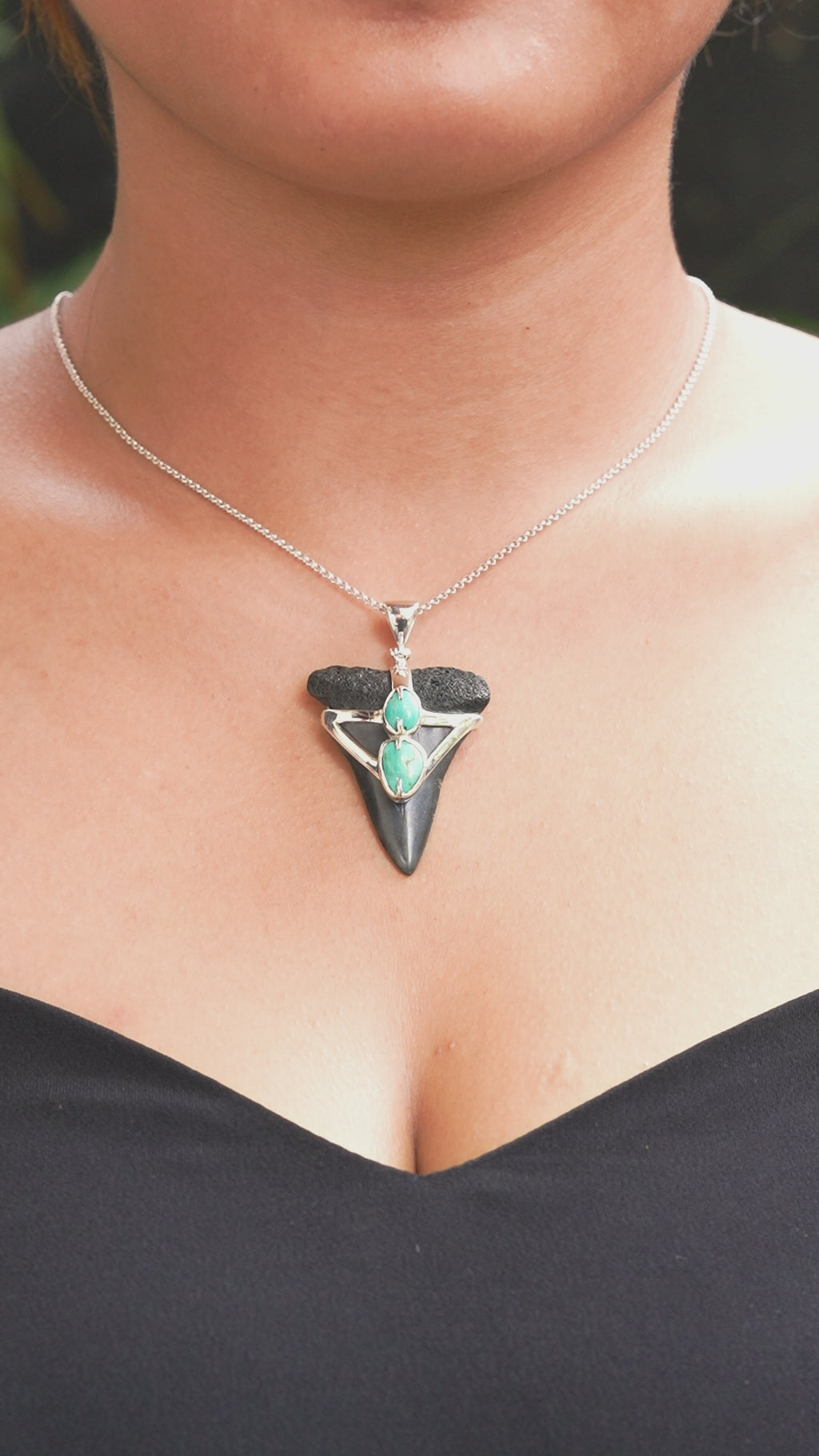 - A striking fossil shark tooth is elegantly cradled by a handcrafted V-wrap setting in solid 925 Sterling Silver, accented with two vivid turquoise stones. The sleek silver design wraps the tooth securely while highlighting its natural contours, blending the raw power of the fossil with modern, symbolic artistry.