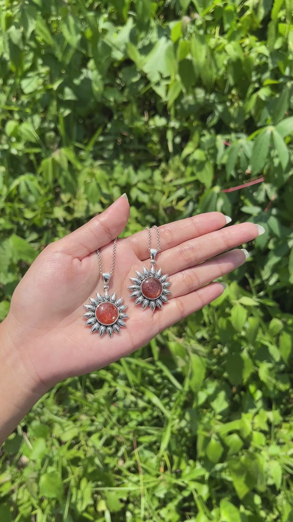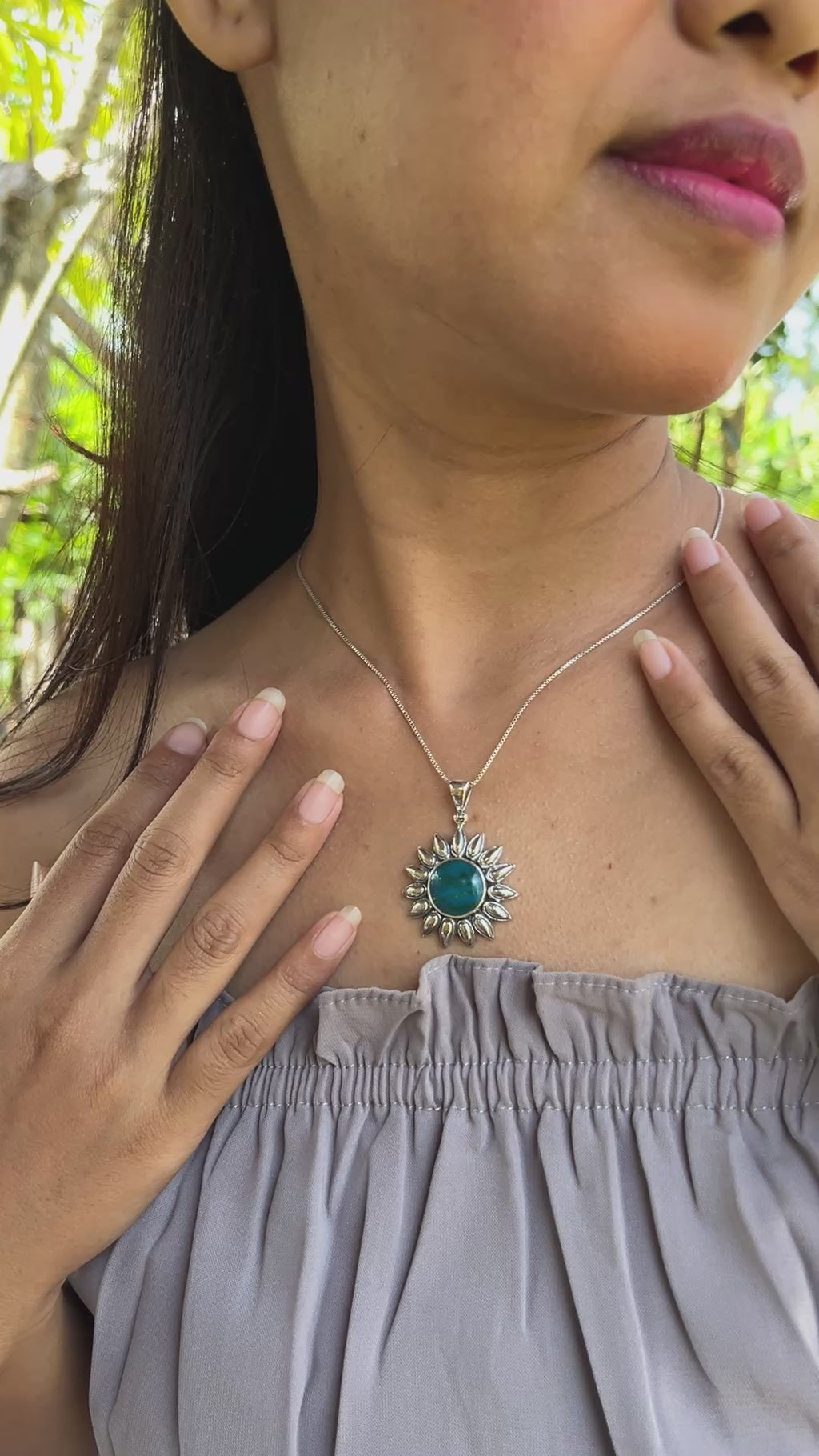 • This Sterling Silver sunflower pendant measures about 1.58 inches tall and showcases a vivid gemstone cabochon at its center. Elegantly bezel set within intricately oxidized silver petals, offering a striking and graceful contrast that exudes understated sophistication. Available in many different stones!