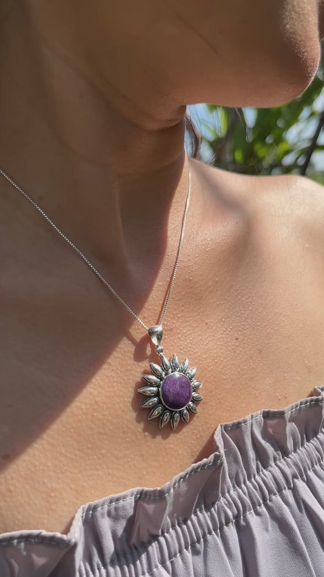 Sun-shaped silver pendant with a purple gemstone on a white background