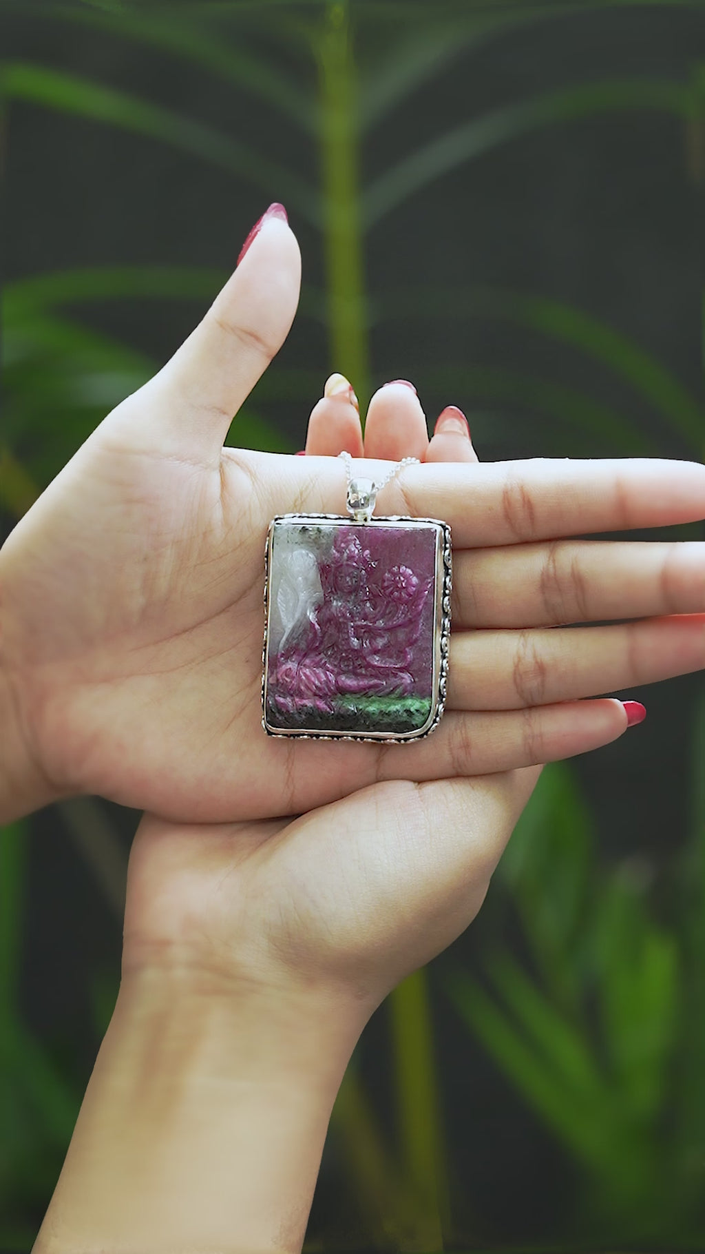 This exceptional pendant features an approximately 177.1 ct Ruby Zoisite, meticulously hand-carved into a serene Tara Goddess seated upon a lotus. The stone’s natural fusion of vivid green zoisite and deep ruby inclusions creates a striking visual contrast, with portions of the lotus glowing in lush green while rich ruby tones bring depth and dimension to the figure. Each color transition is entirely natural, enhancing the carving’s sense of movement and tranquility.