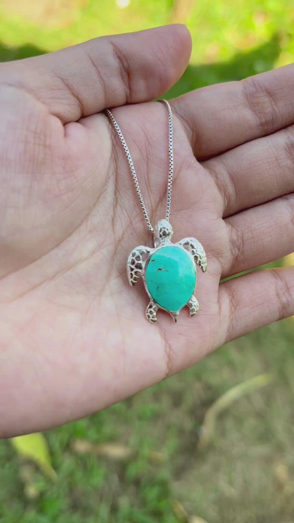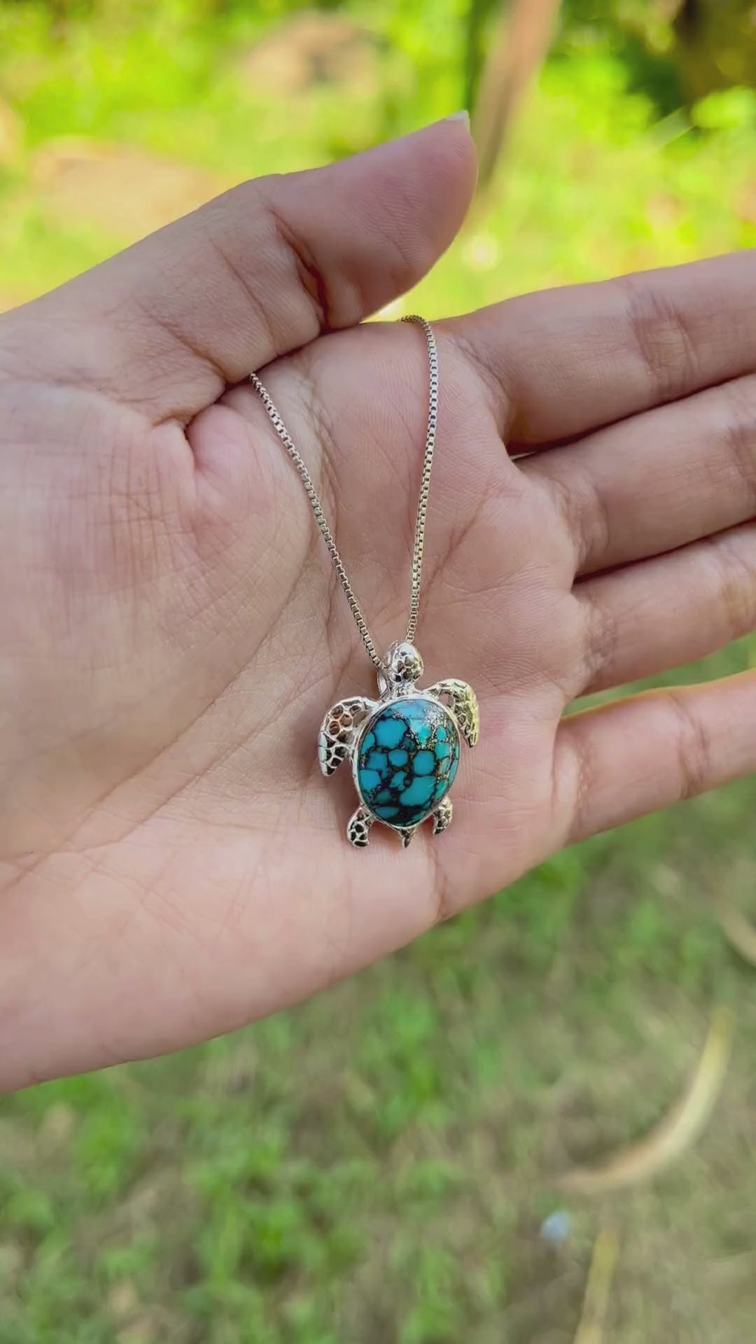- Expertly handcrafted in fine Sterling Silver, this unique pendant features a captivating 15mm oval cabochon gemstone set in a beautifully detailed Sea Turtle design. Measuring approximately 1 x 0.8 inch, it balances natural elegance with playful charm.