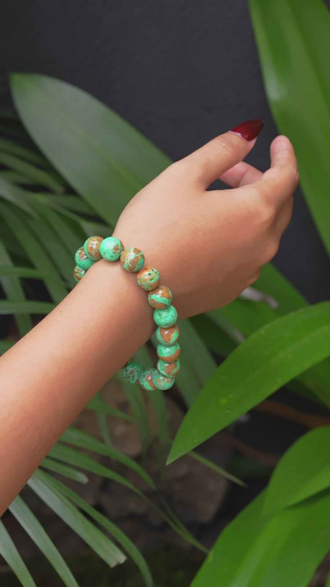 - Rica y terrosa, esta pulsera de Smithsonita hecha a mano presenta vibrantes cuentas verdes con patrones marrones cálidos. Ensartada en elástico de alta calidad para mayor comodidad y elaborada sin metal para un uso agradable a la piel. Unisex y única, disponible en muchos tamaños diferentes. Los colores y patrones pueden variar ligeramente de las imágenes mostradas, haciendo que cada pulsera sea única.