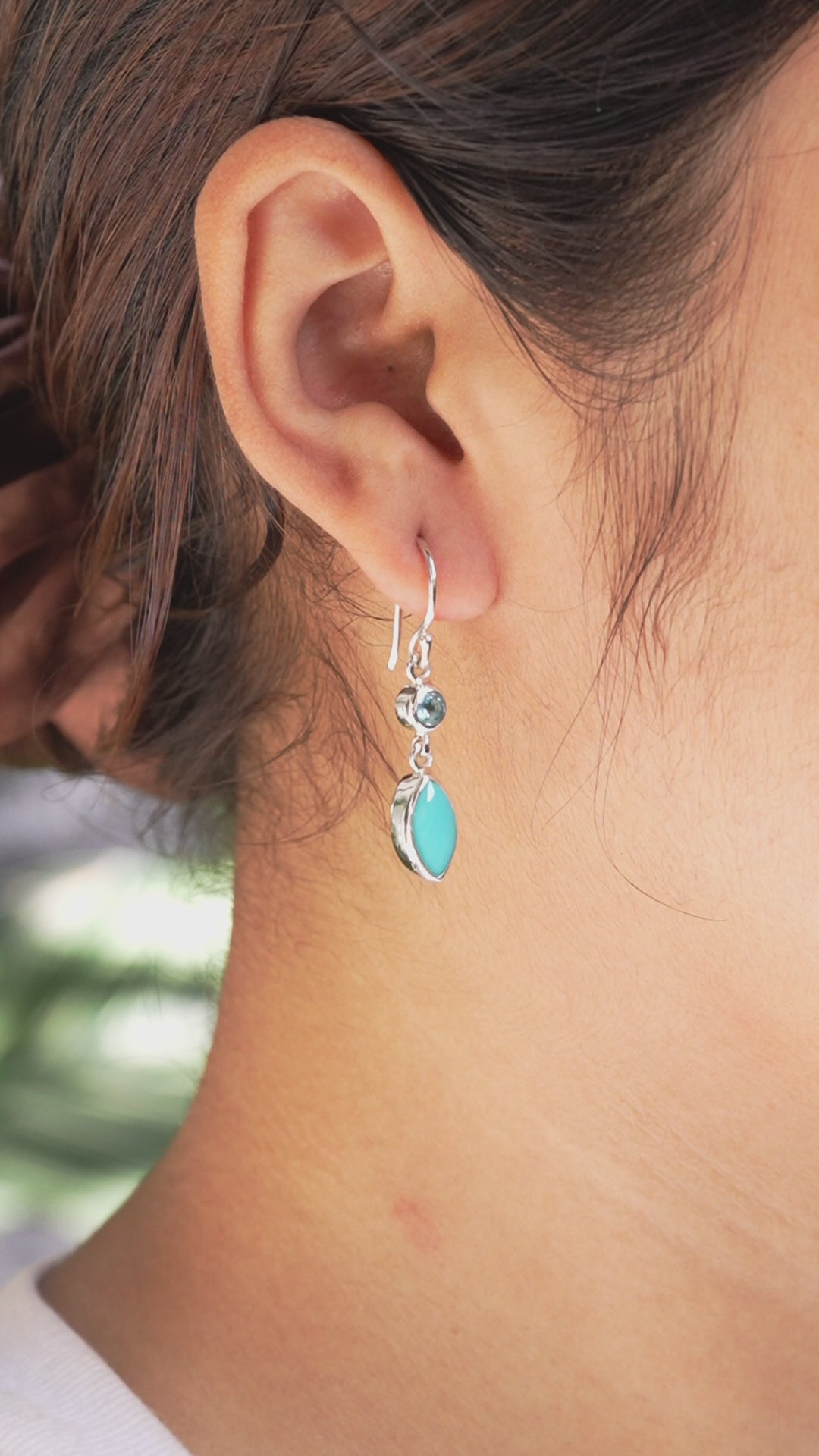 - A sparkling 4 mm round faceted Blue Topaz pairs perfectly with a 12x6 mm Sleeping Beauty Turquoise cabochon, both set in elegant bezel settings. The earrings measure approximately 1.5 inches long, including the ear hook.