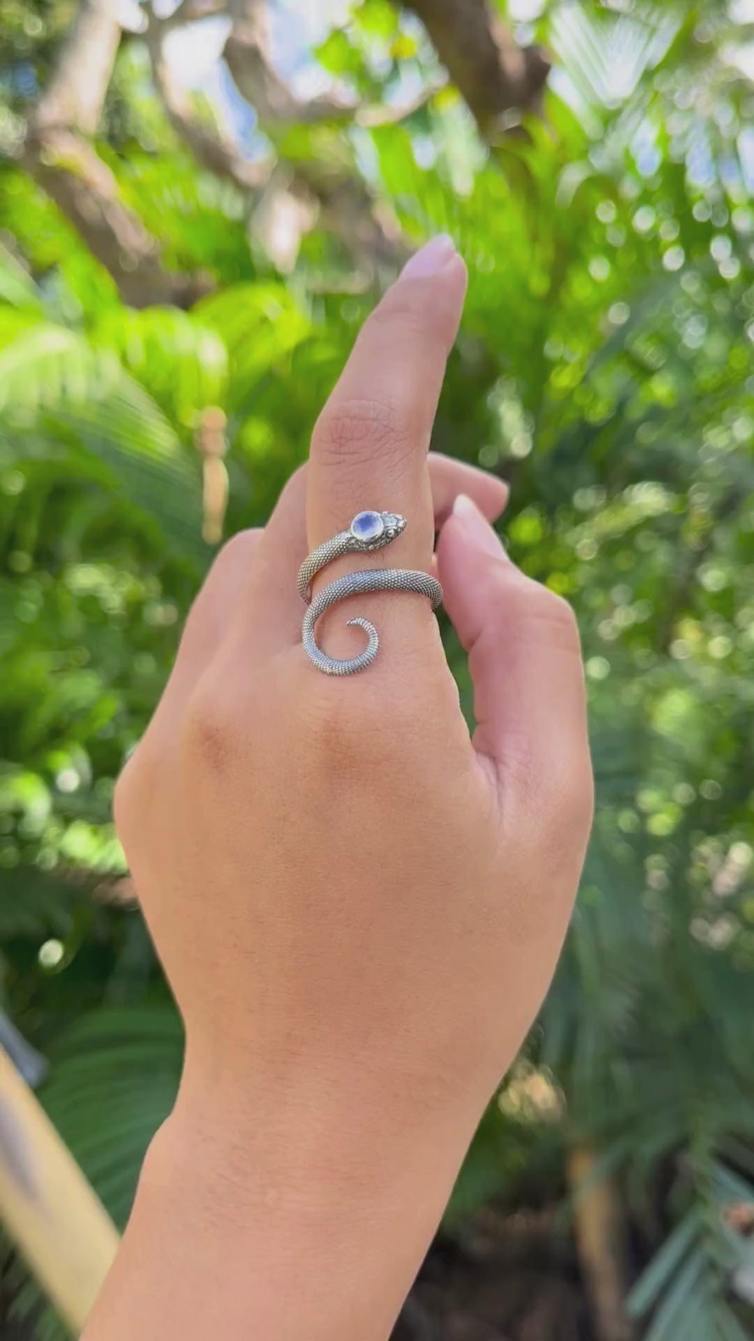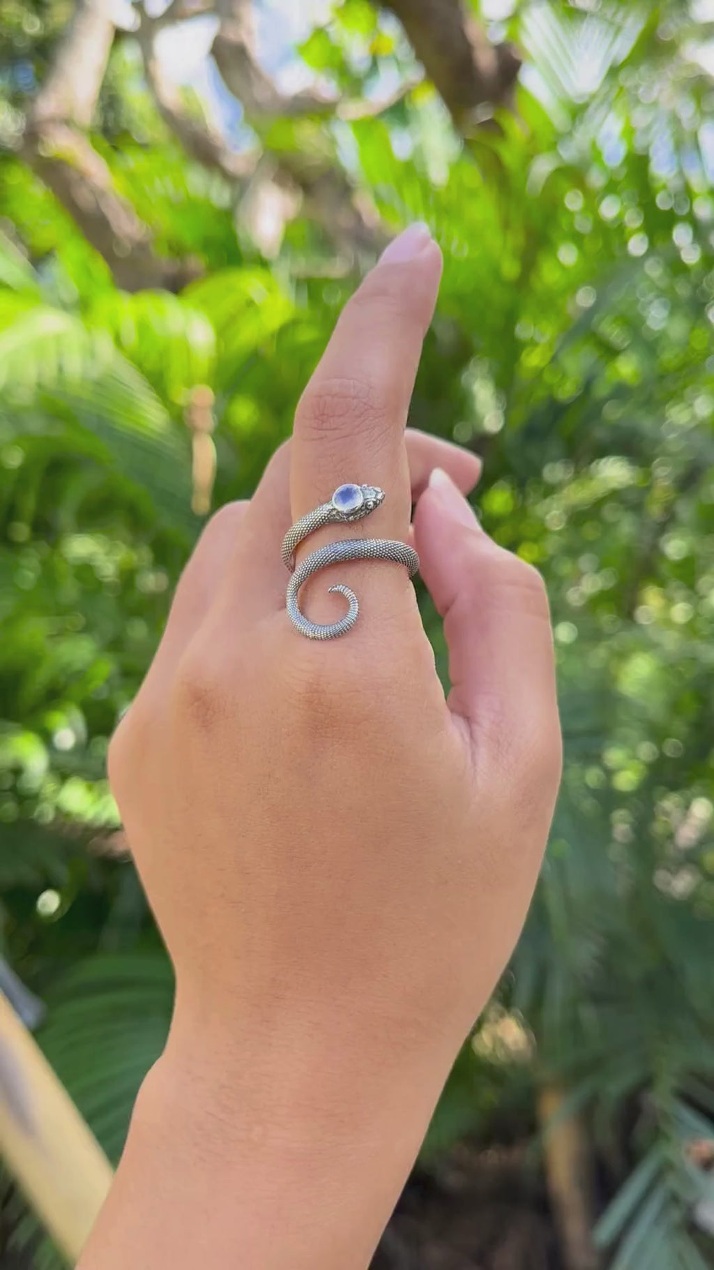 - This striking coiled snake ring showcases a bezel set 4 mm faceted Rainbow Moonstone, while the oxidized Sterling Silver shank boasts intricate snakeskin detailing for a captivating and enchanting finish.