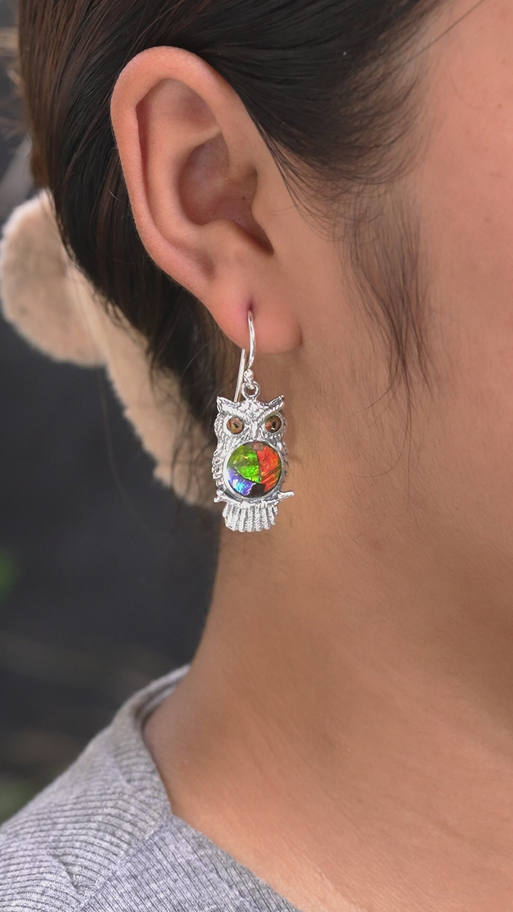 - Graceful and captivating, these Ammolite Inlay Owl Dangle Earrings are exquisitely crafted in 925 Sterling Silver, measuring approximately 1.69" tall by 0.59" wide (4.29 cm x 1.50 cm), including the ear hook. The finely detailed owl design is brought to life by genuine ammolite, meticulously hand-inlaid to reveal its luminous play of color, making this piece a striking expression of artistry and natural beauty.