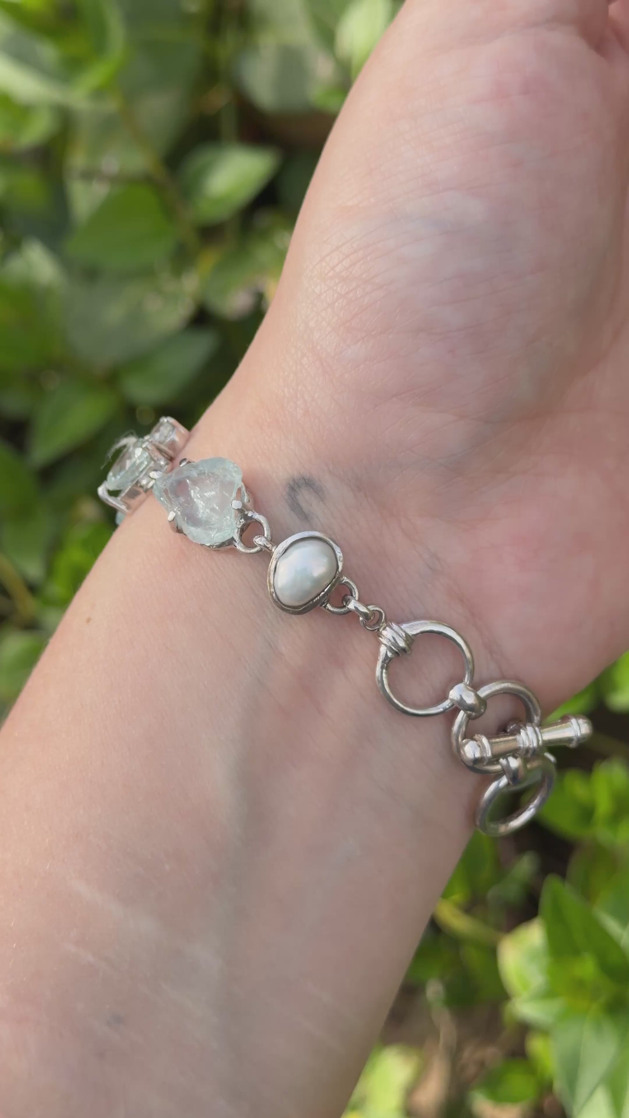 This one-of-a-kind bracelet features a refined combination of faceted Aquamarine and natural rough Aquamarine crystals, accented with freshwater pearls and White Topaz. The contrast between precision-cut facets and organic crystal formations highlights Aquamarine in its most natural and sculptural forms, while the pearls add soft luster and the White Topaz provides subtle brilliance.