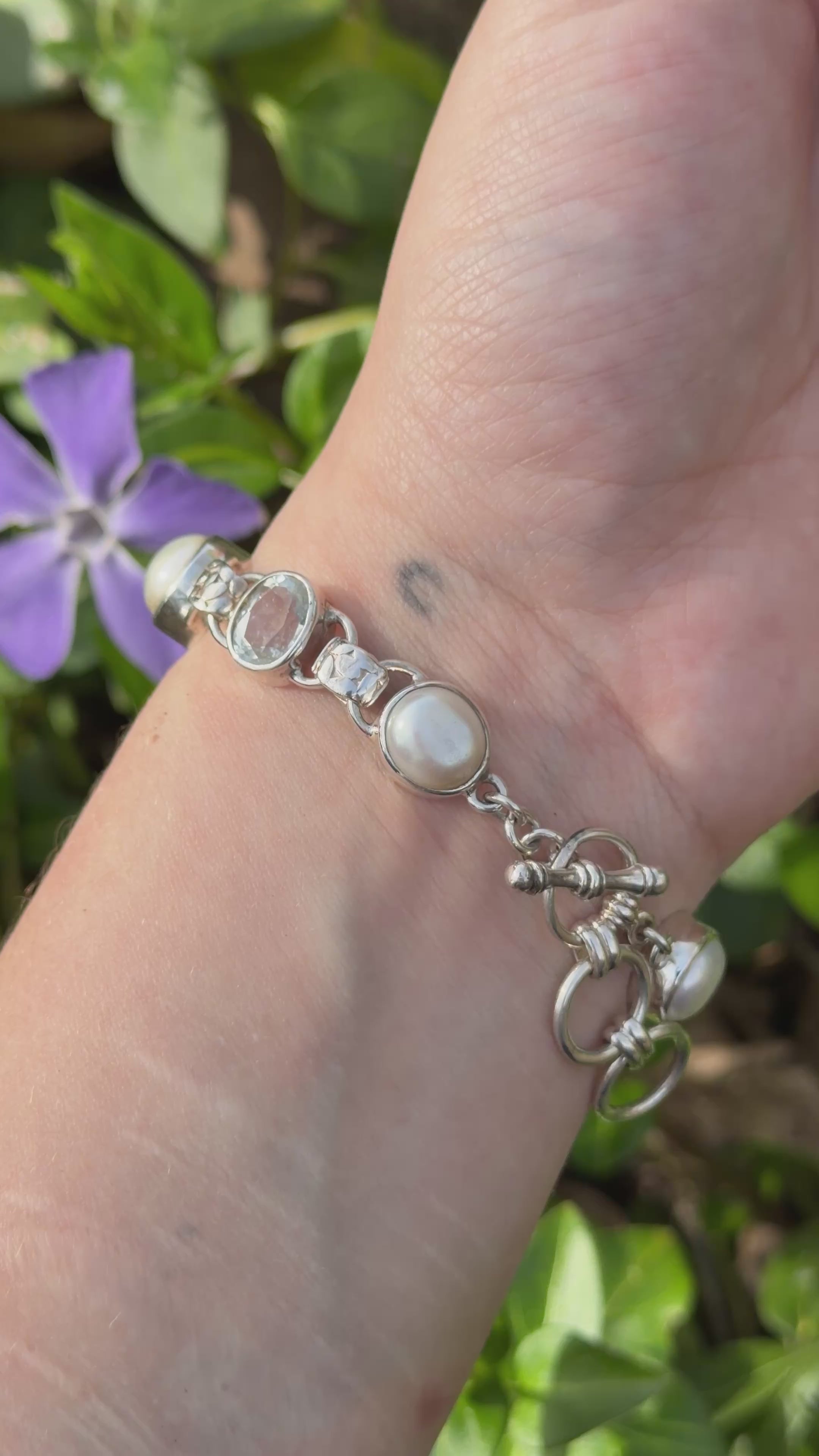 This refined bracelet features three faceted Aquamarine gemstones paired with four freshwater pearls, creating a balanced composition of brilliance and soft luster. The precision faceting enhances Aquamarine’s natural clarity and serene blue tone, while the pearls introduce a timeless elegance and subtle contrast.