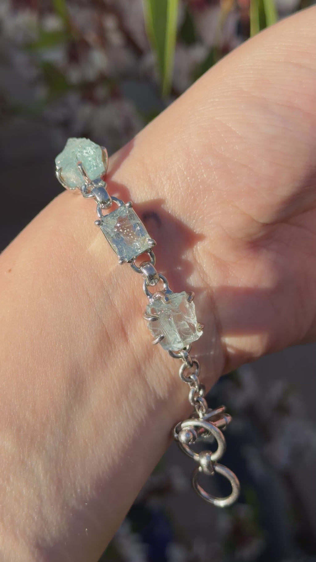 This distinctive bracelet features six faceted Aquamarine gemstones, including one exceptional seafoam green Aquamarine, paired with four natural rough Aquamarine crystals. The interplay between precision faceting and organic crystal structure highlights Aquamarine’s range—from luminous, transparent brilliance to raw, natural formation.