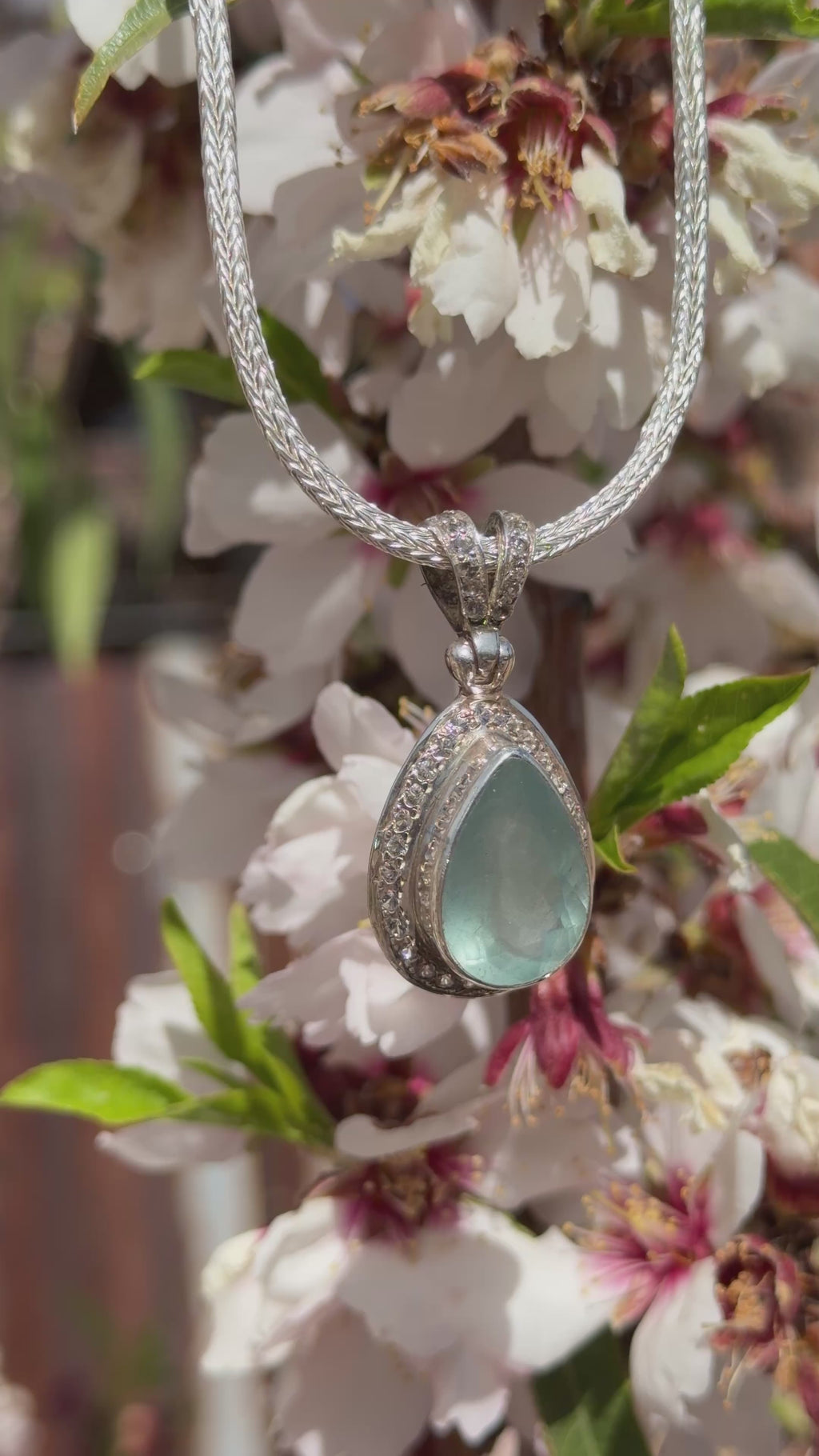 This elegant pendant features a beautifully faceted Aquamarine, framed by a radiant White Topaz pavé halo that enhances the stone’s brilliance and clarity. The precision faceting allows light to pass cleanly through the Aquamarine, highlighting its serene blue tone and exceptional transparency.
