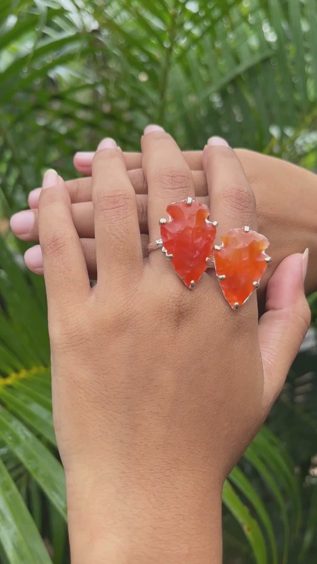 - Expertly handcrafted in fine sterling silver, this captivating ring features a 25–27 mm rough Carnelian arrowhead set in a secure prong setting. The design is enhanced by a 3mm adjustable half-round hammered shank, combining bold natural elegance with artisanal craftsmanship.