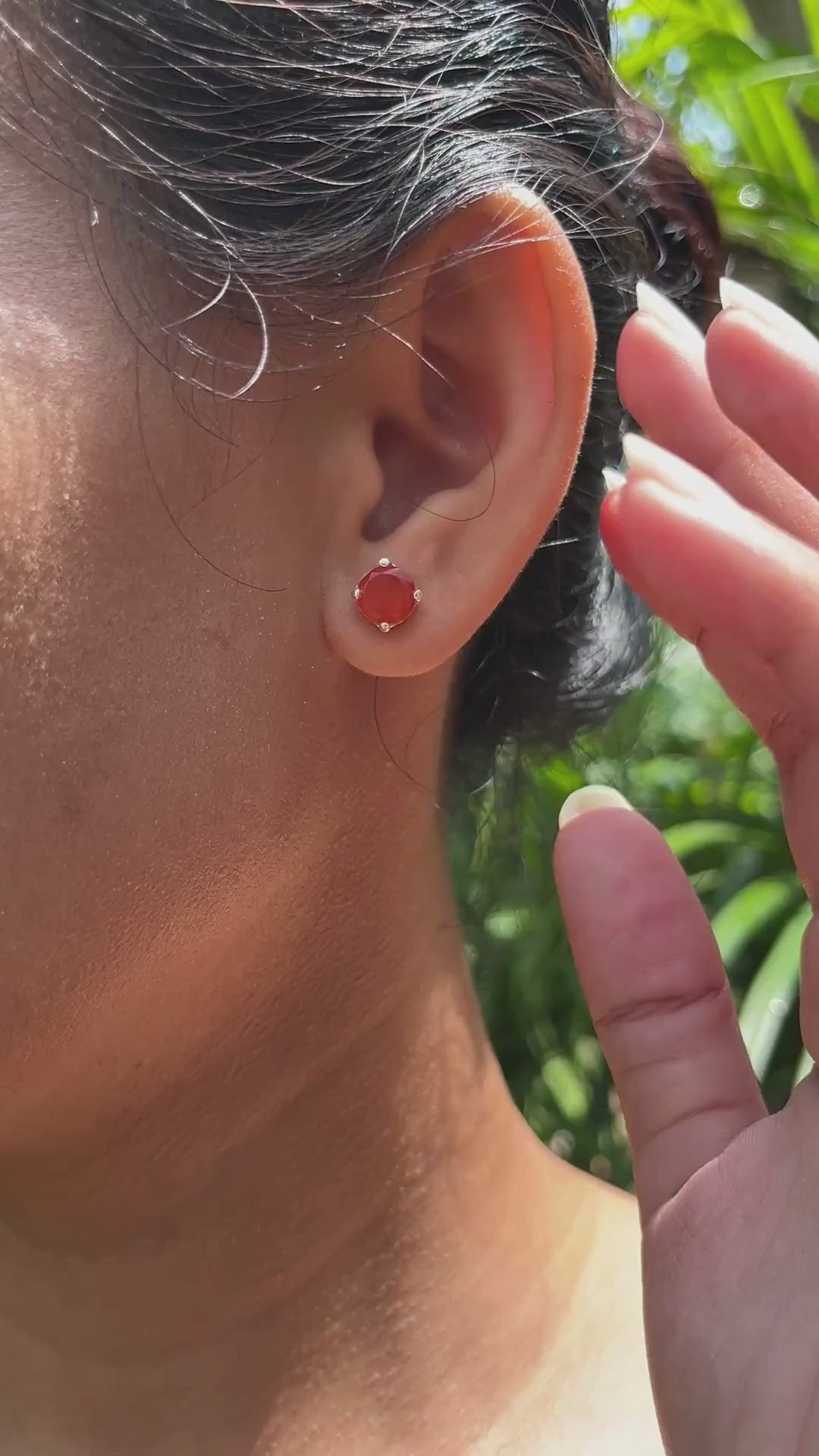 - Handcrafted in Fine Sterling Silver, these Carnelian round post earrings showcase the gem’s rich, fiery glow. The prong setting highlights each stone’s depth and brilliance, creating a timeless, vibrant design. Available in many sizes: