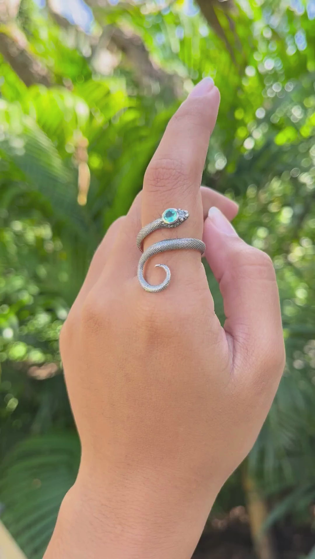 Starborn Coiled Snake Ring with Faceted Apatite in Sterling Silver
