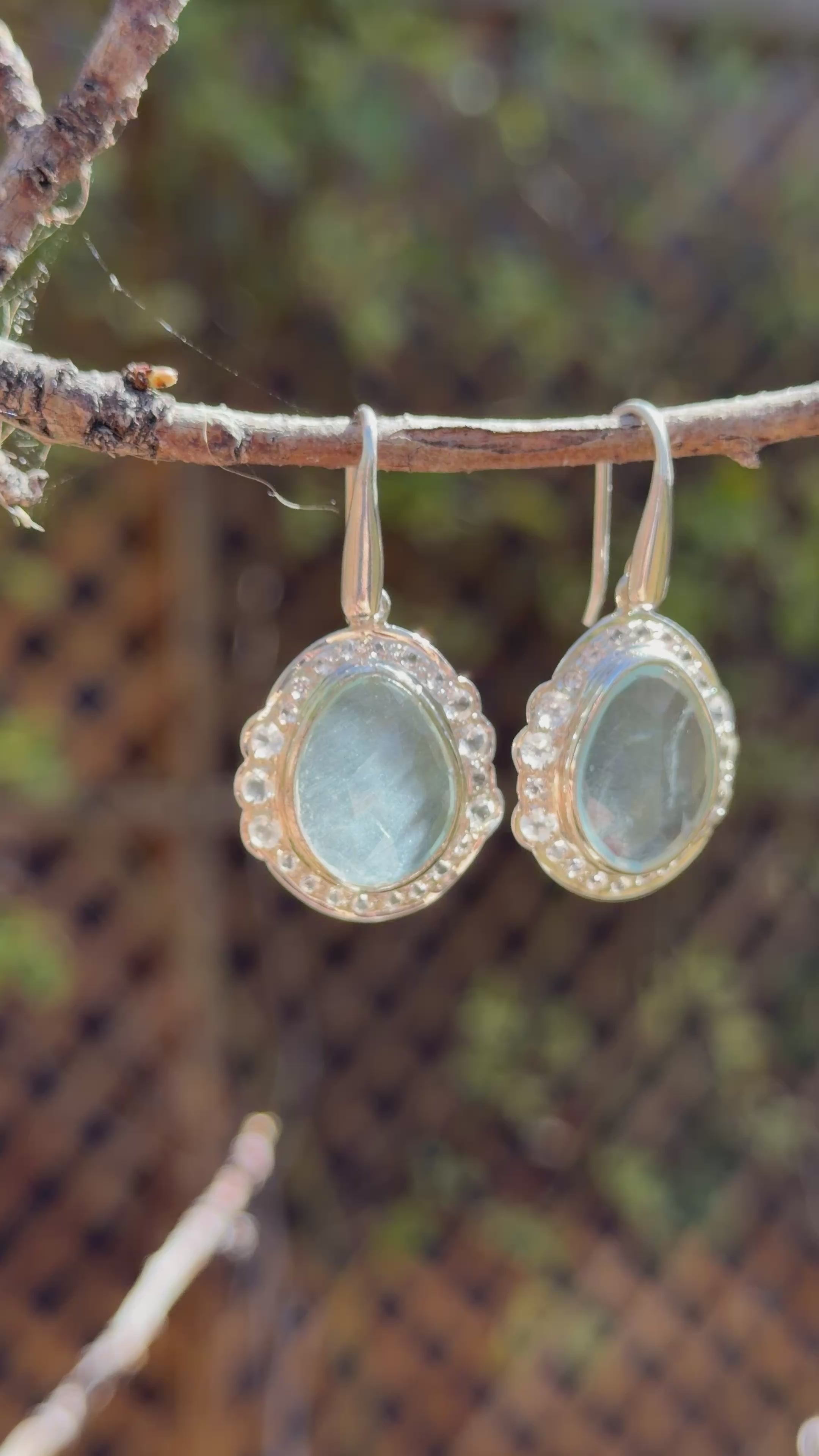 These graceful drop earrings showcase luminous faceted Aquamarine set within a smooth bezel, encircled by a fine halo of shimmering White Topaz pavé. The subtle brilliance of the pavé detailing amplifies the Aquamarine’s cool blue glow, adding dimension and light-catching sparkle with every turn.
