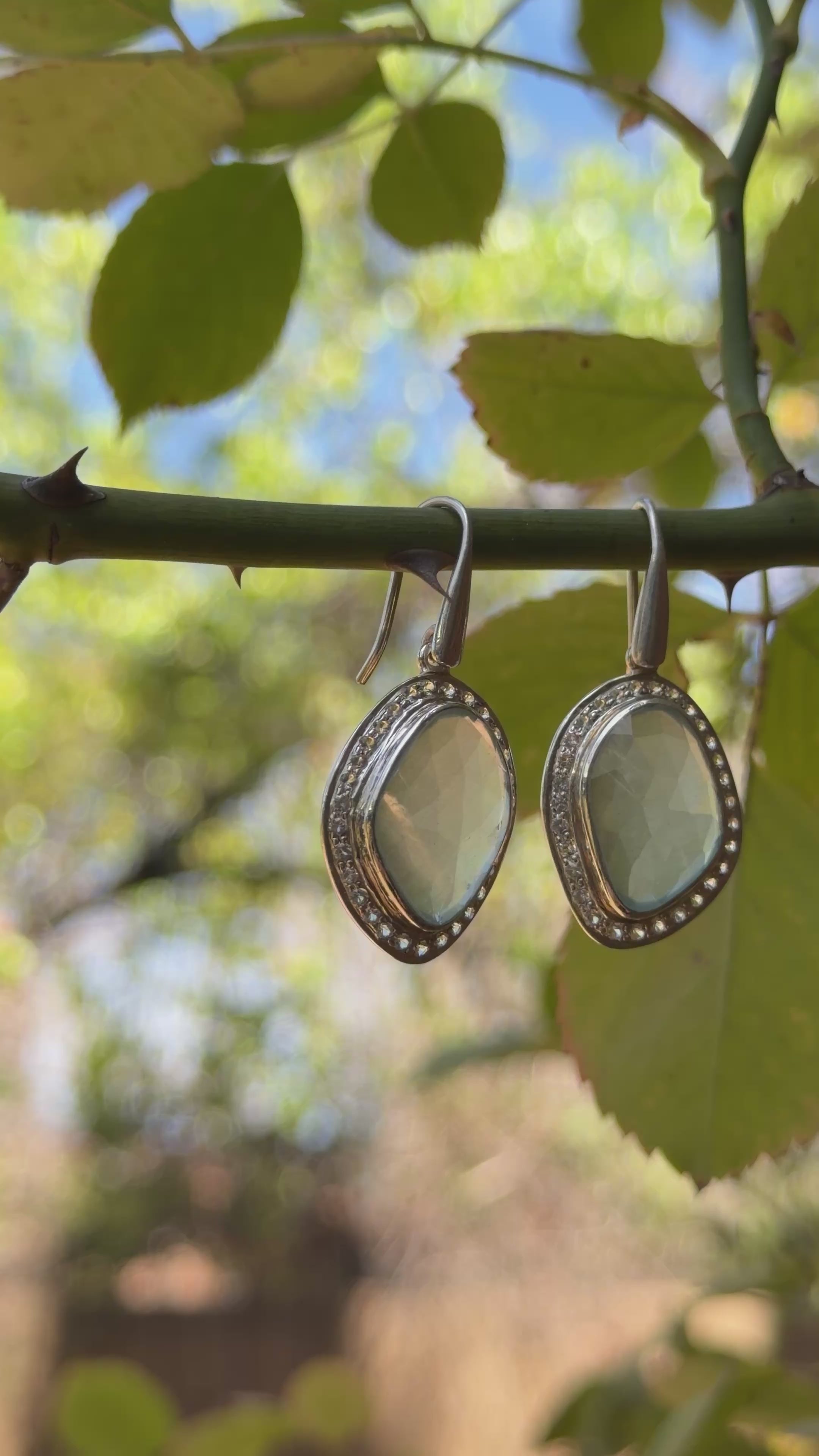 Refined and luminous, these dangle earrings showcase faceted Aquamarine encircled by a delicate White Topaz pavé bezel, creating a radiant halo effect that enhances the stone’s natural brilliance. The precision faceting maximizes light return, allowing the Aquamarine’s clear, ocean-blue tones to glow with exceptional clarity.