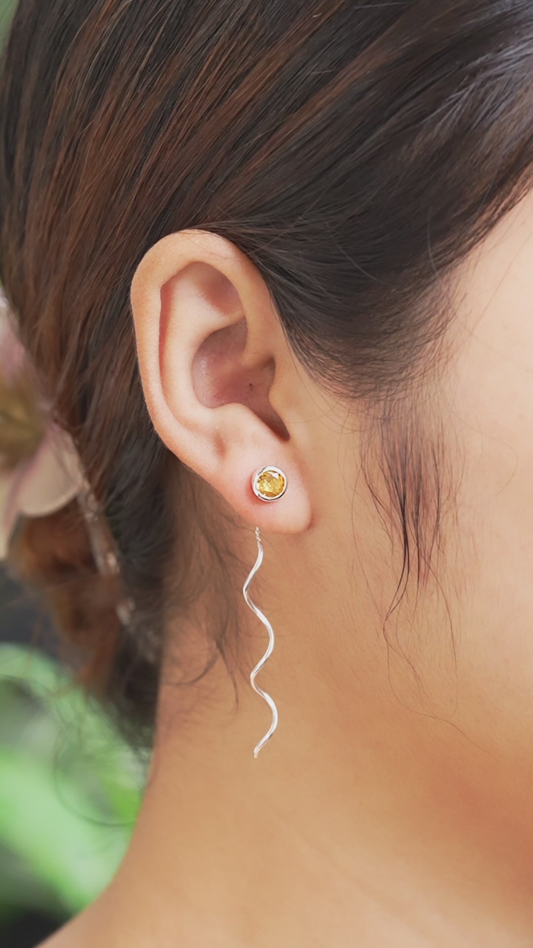 - Handcrafted in 925 Sterling Silver, these stud earrings feature a hand-selected 5mm faceted Citrine set in a smooth bezel. A delicate 1.5cm chain with a flowing 4cm curled wire drop moves gracefully, catching the light and highlighting Citrine’s warm, golden-yellow glow.