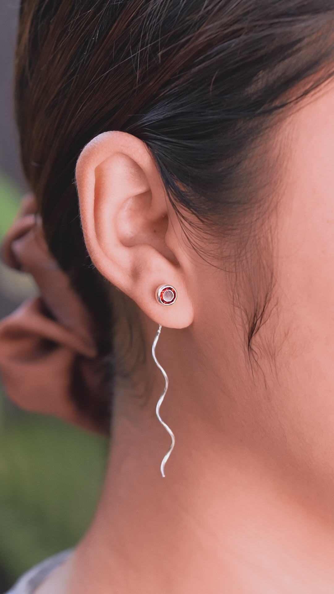 - Handcrafted in 925 Sterling Silver, these stud earrings feature a 5mm faceted Garnet set in a smooth bezel. A delicate 1.5cm chain with a flowing 4cm curled wire drop moves gracefully, catching the light and accentuating Garnet’s deep, radiant red hues.