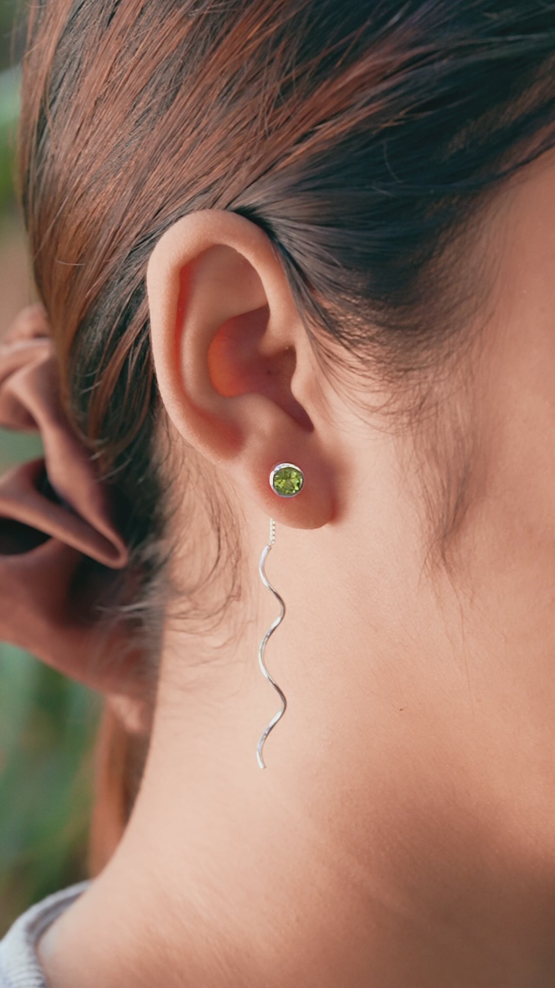 - Handcrafted in 925 Sterling Silver, these stud earrings showcase a 5mm faceted Peridot glowing in a smooth bezel. Hidden behind the setting, a tiny silver ring links a delicate 1.5 cm chain and a flowing 4 cm curled wire drop. The layered design moves with ease, catching the light and accentuating the Peridot’s fresh, vibrant green hue.