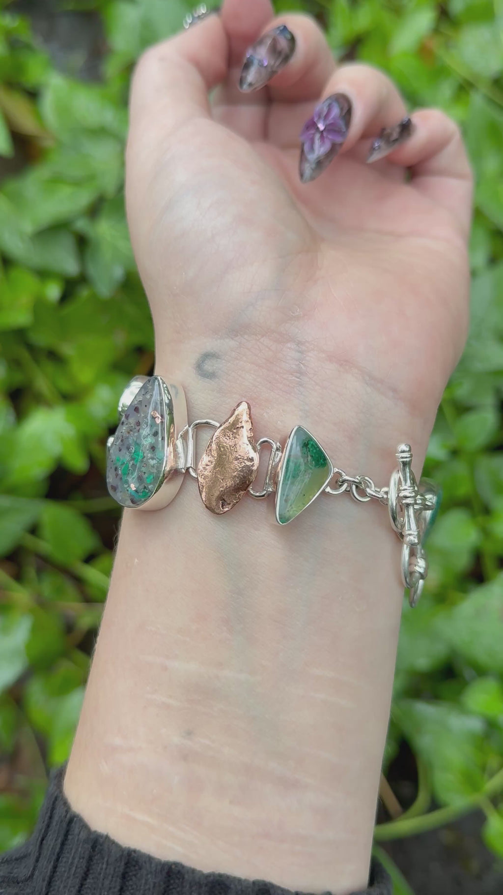 This one of a kind handcrafted bracelet in fine Sterling Silver is a celebration of vibrant color and natural artistry. Featuring a harmonious blend of Copper nuggets, 1.7 carats of faceted Apatite, 23 carats of vivid Gem Silica, and the rare and mesmerizing Confetti Chalcedony — a unique variety combining Gem Silica, Lavender Chalcedony, and native Copper inclusions.