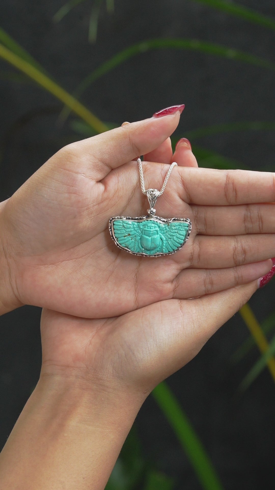 This exquisitely hand-carved Turquoise Scarab Pendant showcases exceptional lapidary artistry, with finely detailed wings and a carefully sculpted form that highlights the natural beauty of the stone. Every contour and engraved line reflects precision craftsmanship, resulting in a piece that feels both sculptural and refined.