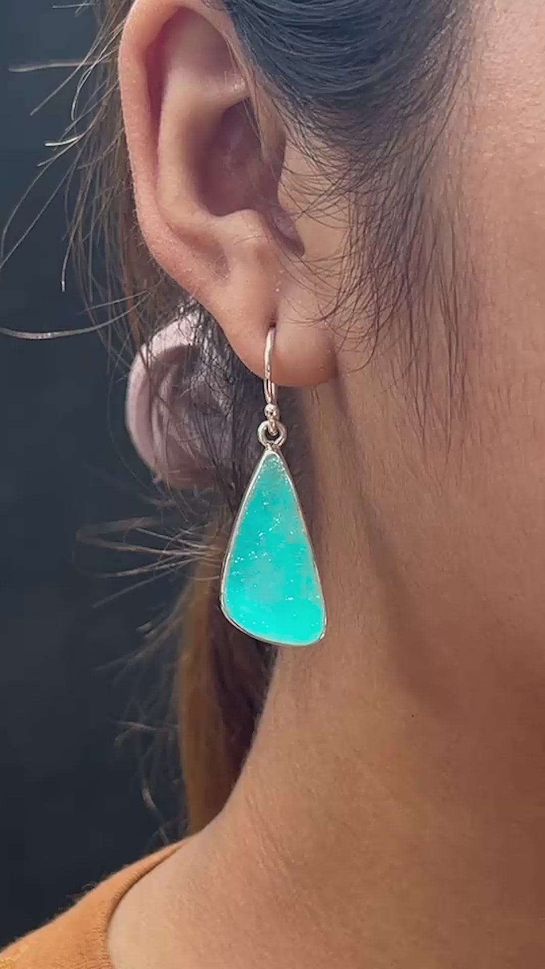 Mined exclusively in Mfouati, Congo, Hemimorphite is prized for its intense blue color and sparkling surface, making it a scarce and highly collectible gemstone. Measuring 1.8" tall by 0.57" wide, this piece is completely one-of-a-kind, and you will receive the exact earring shown.