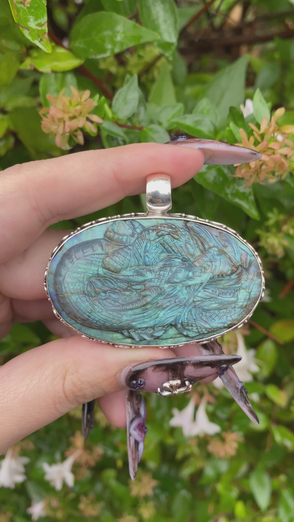 A striking fusion of artistry and natural wonder, this one-of-a-kind pendant features a meticulously handcarved dragon from a single piece of Labradorite, weighing 116.3cts. The stone displays captivating blue flash across its surface, revealing Labradorite’s signature play of light as it catches every angle.