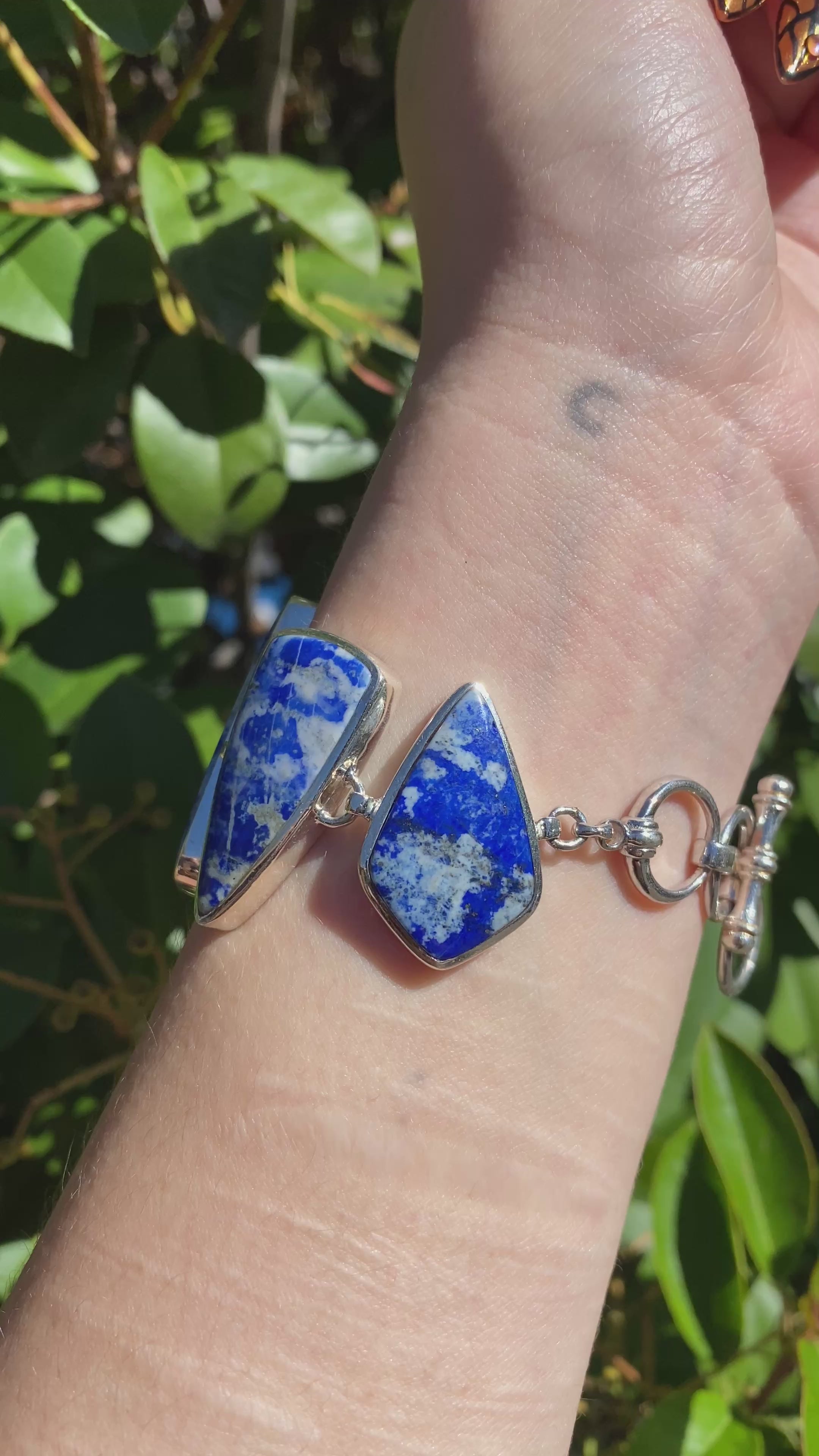 Handcrafted in 925 Sterling Silver, this elegant one of a kind bracelet features six polished Lapis Lazuli cabochons, each showcasing the stone’s signature deep blue hue and subtle golden pyrite inclusions.